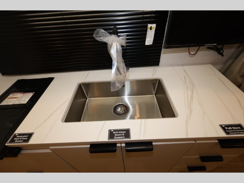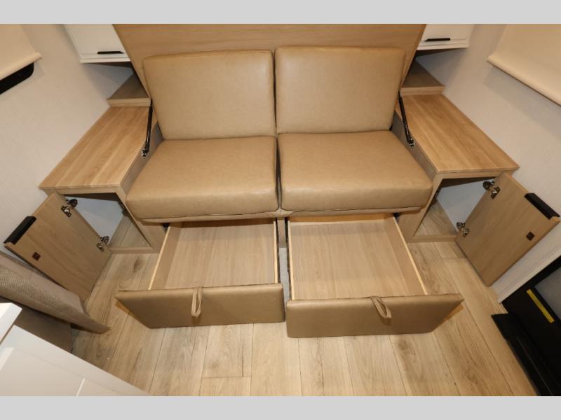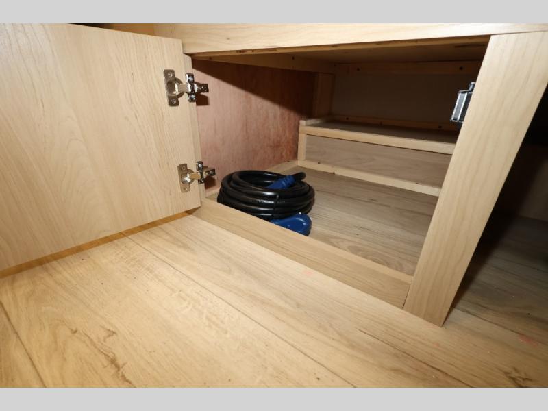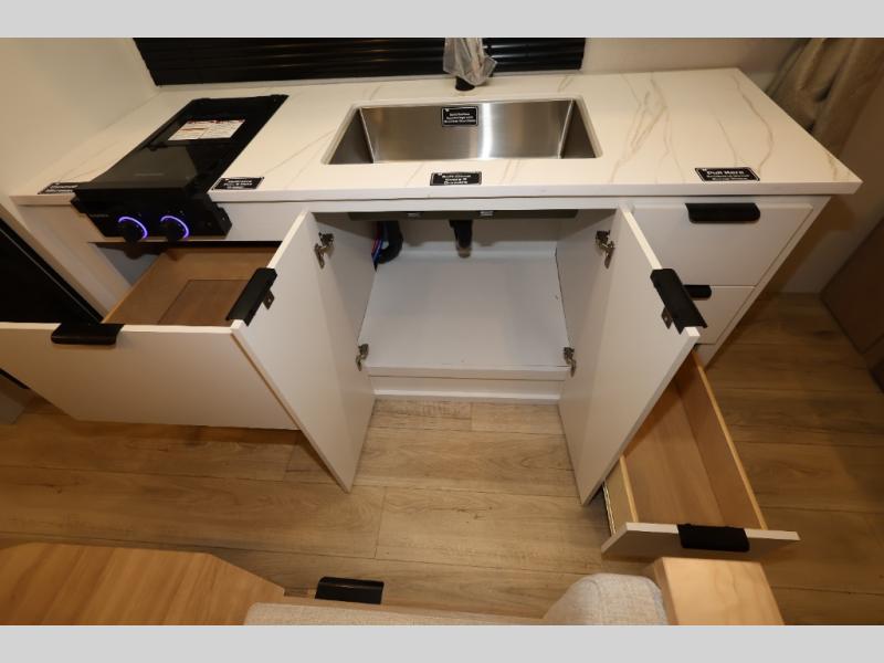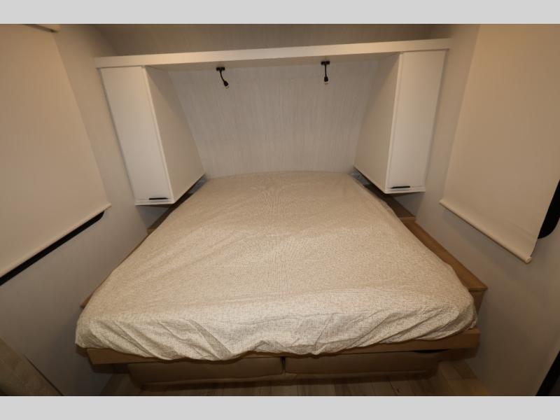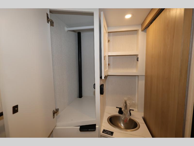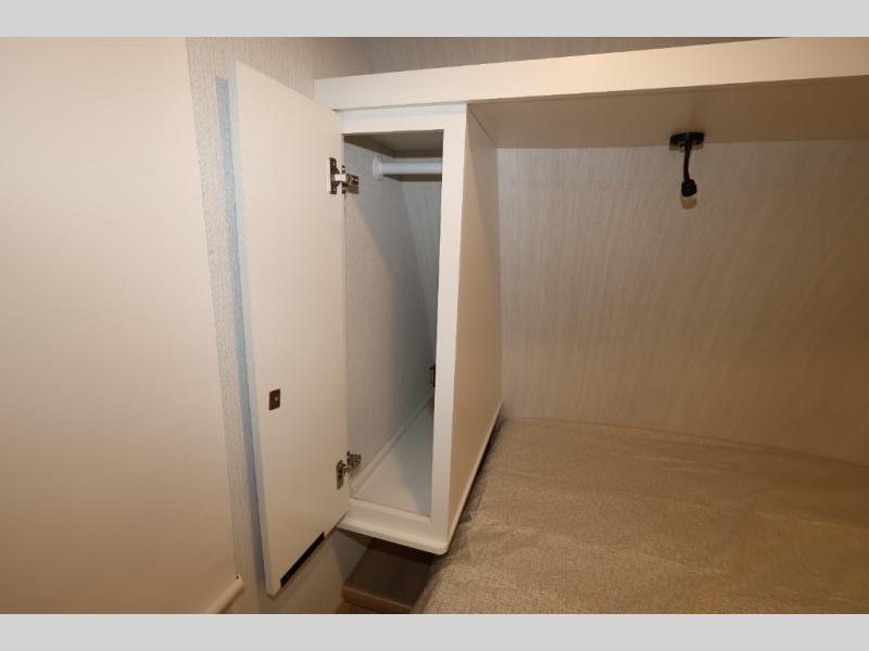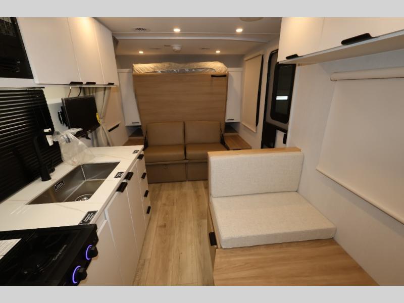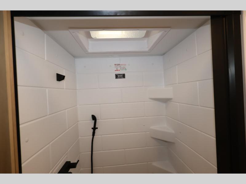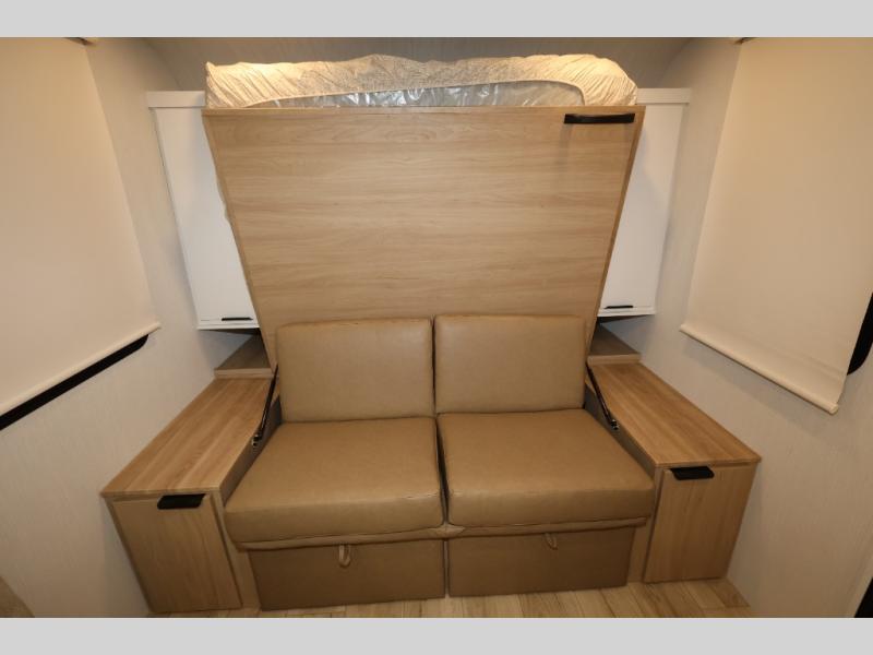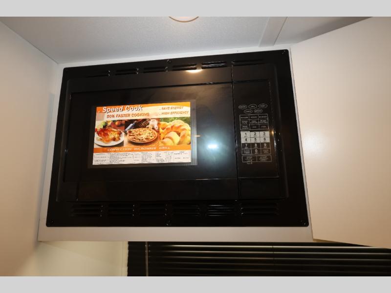 You'll love camping in this travel trailer with front Murphy bed that will provide versatile seating and sleeping space. You can whip up your best meals on the two-burner cooktop or in the convection microwave, and there is a 10-cu. ft. 12V refrigerator to keep your food fresh. You can dine at the booth dinette, play a game of cards after dinner, and convert to sleeping space for guests. A full rear bath will let you clean up after a day outdoors, and you'll appreciate the bath wardrobe/linen closet to keep clean towels and clothes close by!