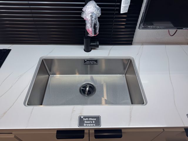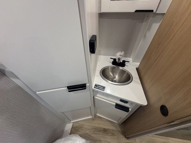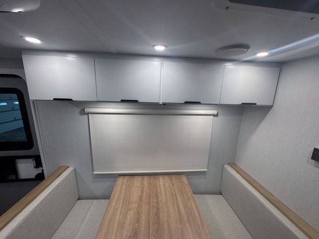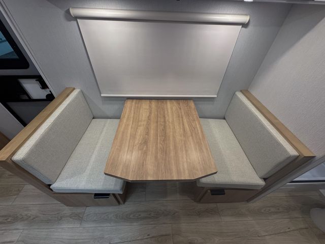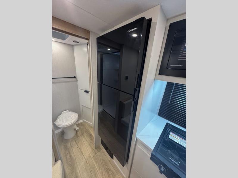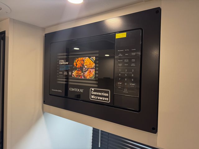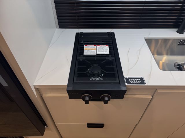 Prepare everything from quick breakfasts to full dinners with the efficient kitchen layout. The two-burner cooktop and convection microwave give you multiple cooking options, while the 10 cu. ft. 12V refrigerator keeps groceries fresh for extended trips. The booth dinette offers a comfortable place to enjoy meals, play cards, or plan the next day’s adventure—and it easily converts into an additional sleeping space for guests.