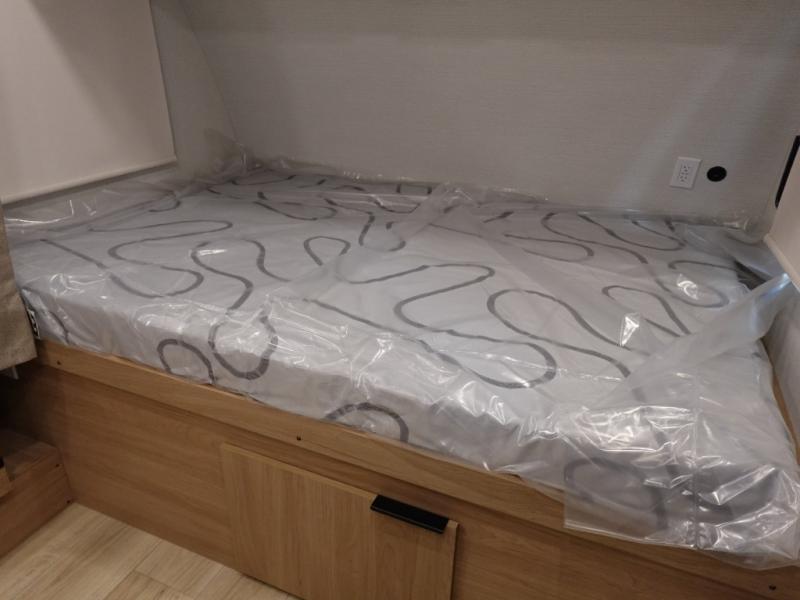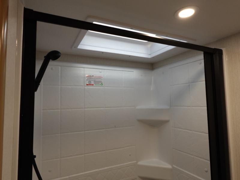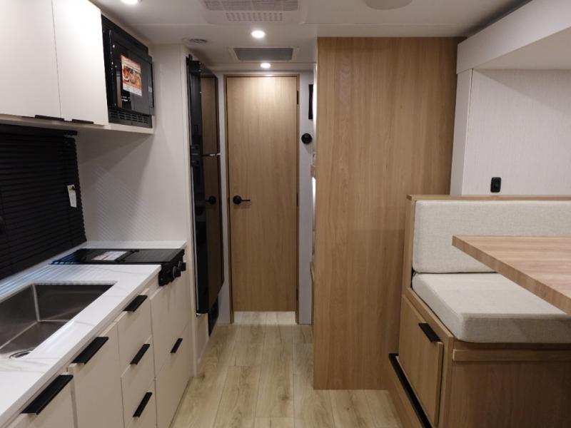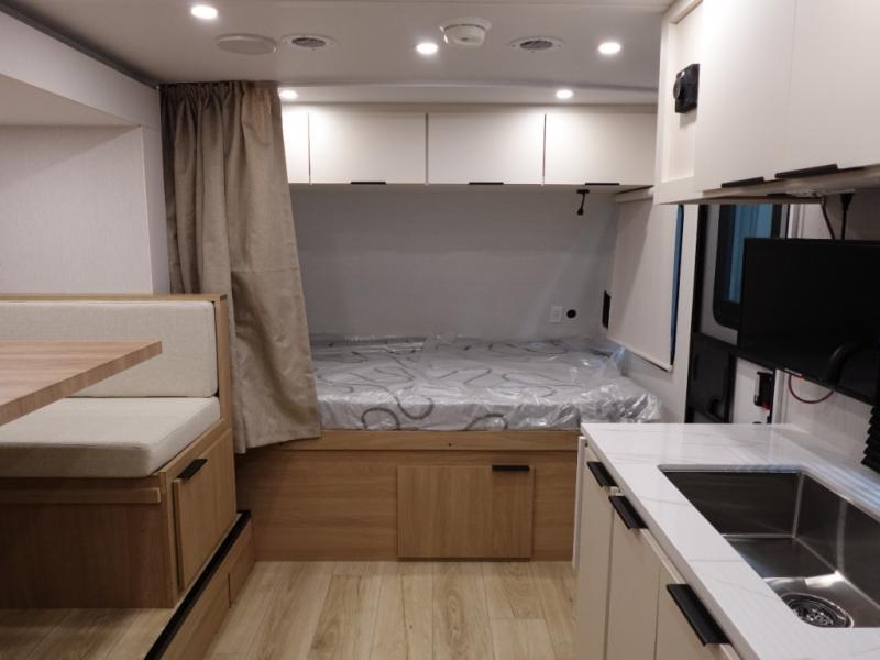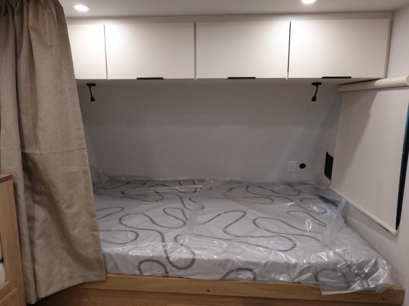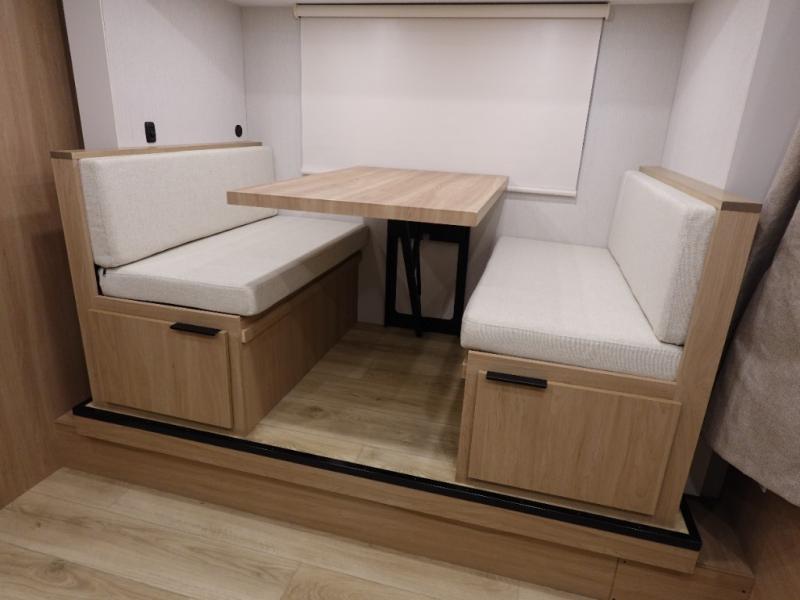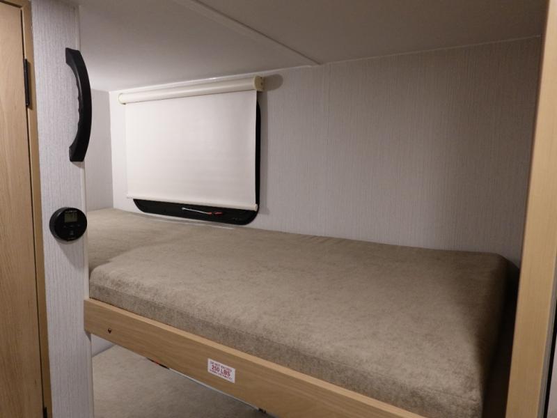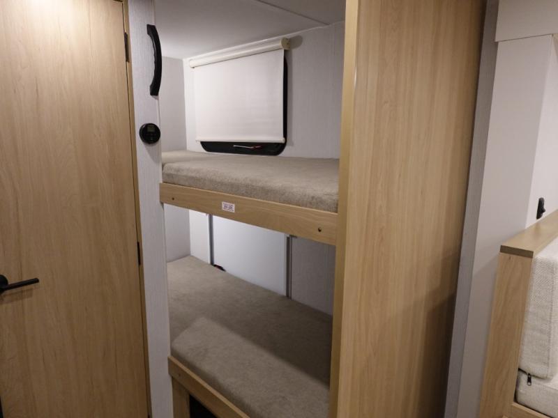 Get ready for a fun family weekend in the great outdoors with this trailer only steps away to enjoy inside comforts! The cook will love having everything to make warm meals, and can easily store leftovers in the 10.3 cu. ft. 12V refrigerator, plus the flip-up counter gives them more space to prep or dry the dishes. The front 54" x 74" full bed has a divider curtain for privacy at night and the rear corner 28" x 72" bunk beds are conveniently next to the private toilet and shower room. The booth dinette slide gives you a place to dine as well as sleep one more person, plus you will love the extra floor space that it provides. You might like to choose the EZ Glide Sofa Sleeper and table option in its place, the option is yours!