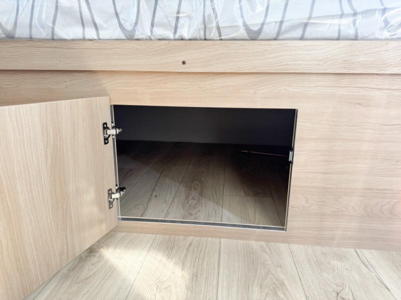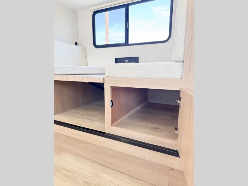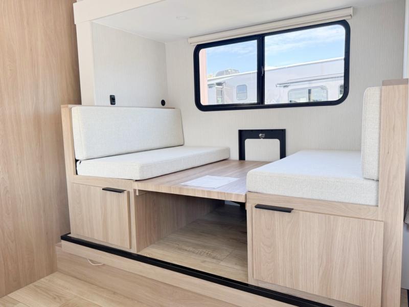 Get ready for a fun family weekend in the great outdoors with this trailer only steps away to enjoy inside comforts! The cook will love having everything to make warm meals, and can easily store leftovers in the 10.3 cu. ft. 12V refrigerator, plus the flip-up counter gives them more space to prep or dry the dishes. The front 54" x 74" full bed has a divider curtain for privacy at night and the rear corner 28" x 72" bunk beds are conveniently next to the private toilet and shower room. The booth dinette slide gives you a place to dine as well as sleep one more person, plus you will love the extra floor space that it provides. You might like to choose the EZ Glide Sofa Sleeper and table option in its place, the option is yours!