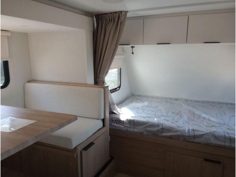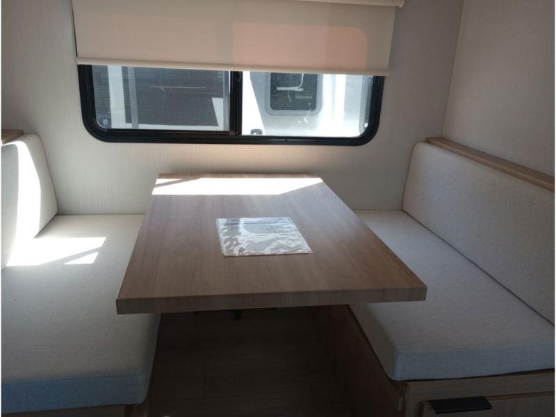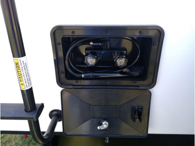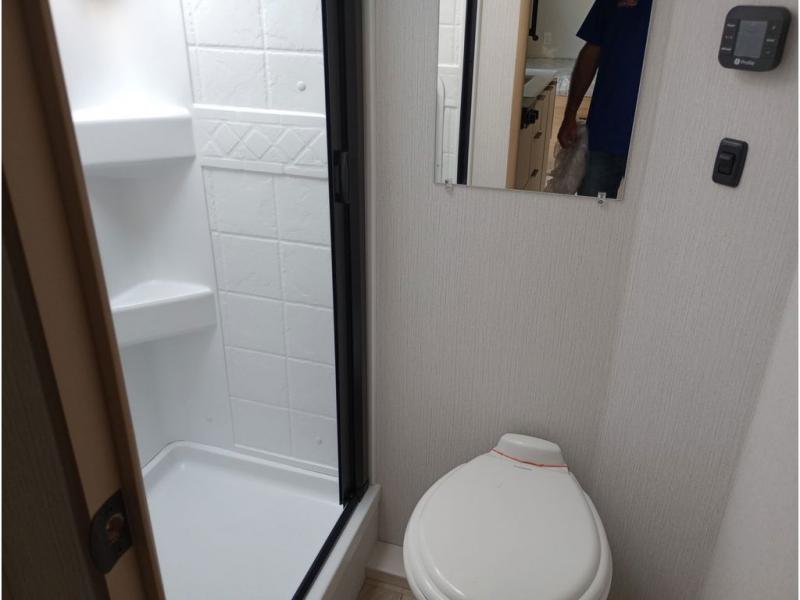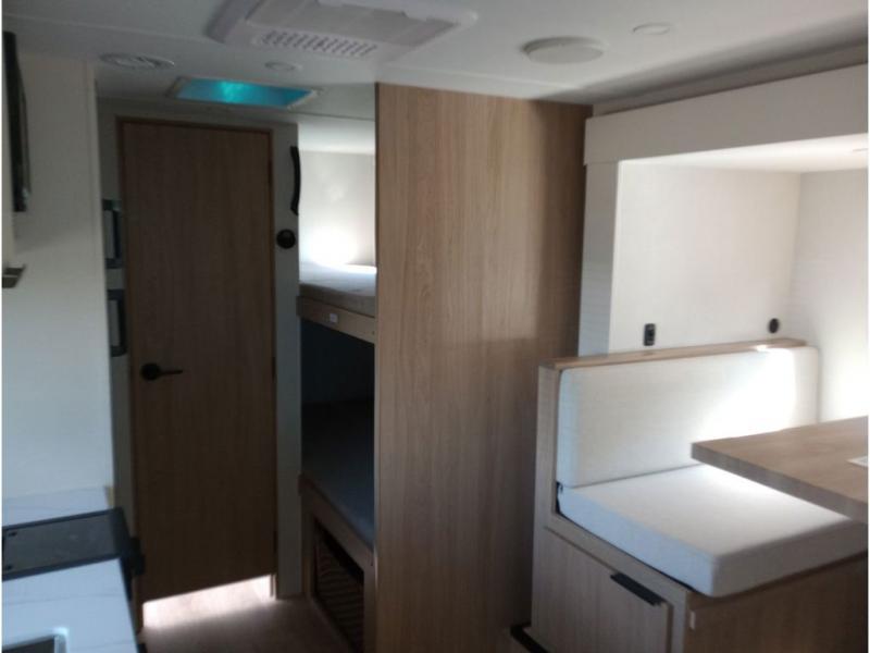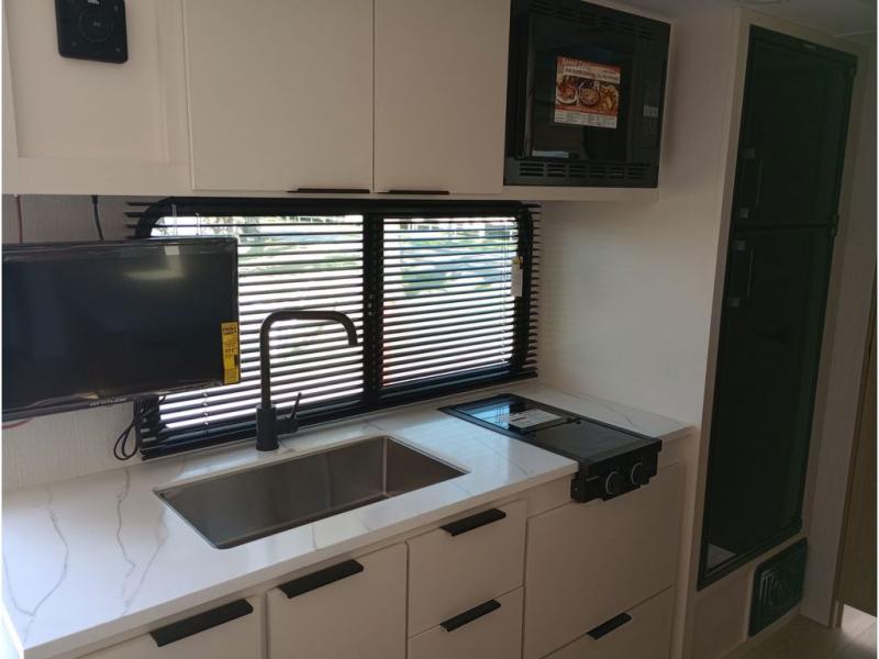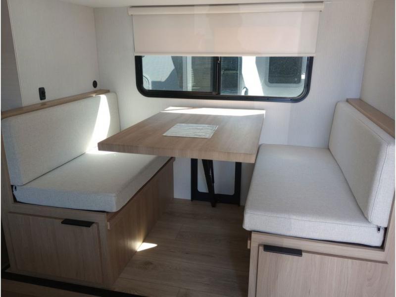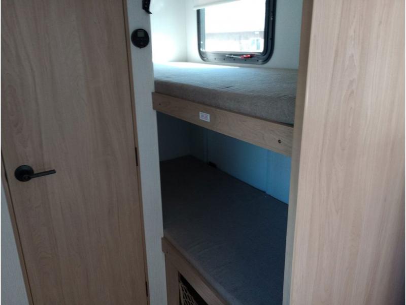 Get ready for a fun family weekend in the great outdoors with this trailer only steps away to enjoy inside comforts! The cook will love having everything to make warm meals, and can easily store leftovers in the 10.3 cu. ft. 12V refrigerator, plus the flip-up counter gives them more space to prep or dry the dishes. The front 54" x 74" full bed has a divider curtain for privacy at night and the rear corner 28" x 72" bunk beds are conveniently next to the private toilet and shower room. The booth dinette slide gives you a place to dine as well as sleep one more person, plus you will love the extra floor space that it provides. You might like to choose the EZ Glide Sofa Sleeper and table option in its place, the option is yours!