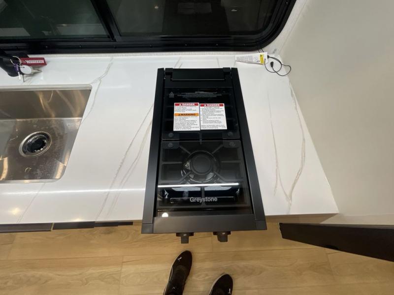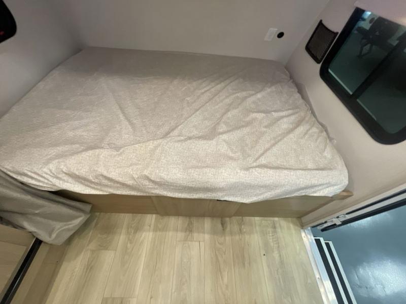 Get ready for a fun family weekend in the great outdoors with this trailer only steps away to enjoy inside comforts! The cook will love having everything to make warm meals, and can easily store leftovers in the 10.3 cu. ft. 12V refrigerator, plus the flip-up counter gives them more space to prep or dry the dishes. The front 54" x 74" full bed has a divider curtain for privacy at night and the rear corner 28" x 72" bunk beds are conveniently next to the private toilet and shower room. The booth dinette slide gives you a place to dine as well as sleep one more person, plus you will love the extra floor space that it provides. You might like to choose the EZ Glide Sofa Sleeper and table option in its place, the option is yours!