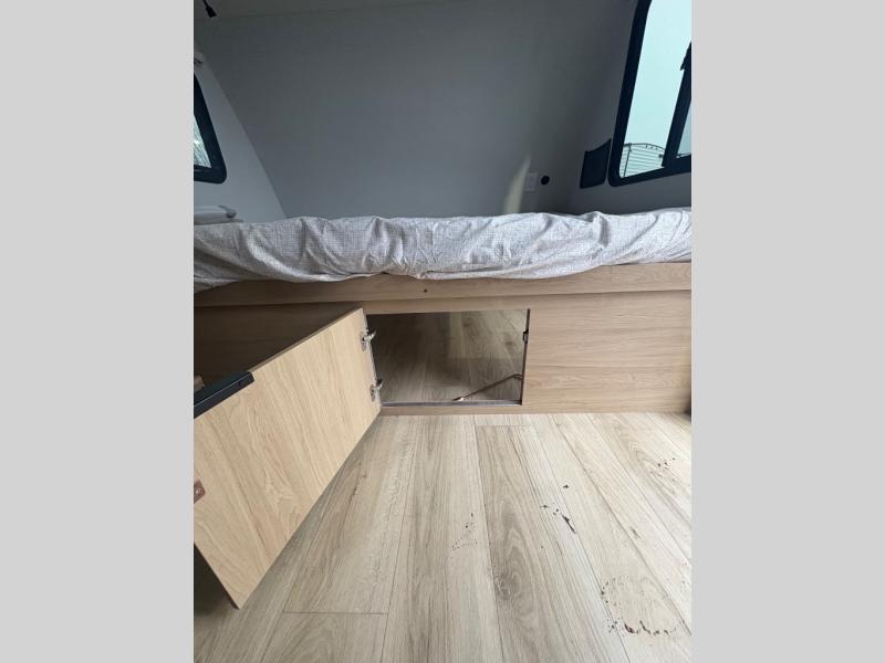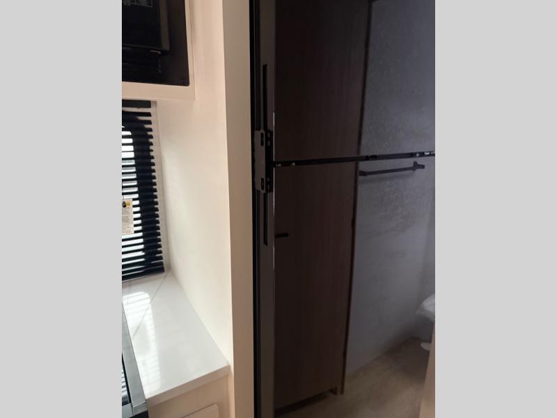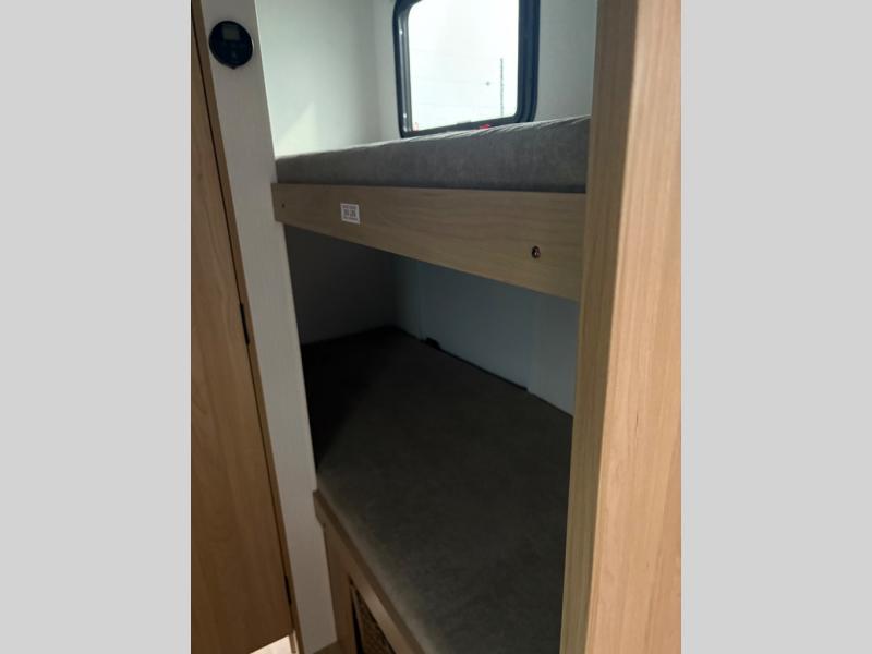 Get ready for a fun family weekend in the great outdoors with this trailer only steps away to enjoy inside comforts! The cook will love having everything to make warm meals, and can easily store leftovers in the 10.3 cu. ft. 12V refrigerator, plus the flip-up counter gives them more space to prep or dry the dishes. The front 54" x 74" full bed has a divider curtain for privacy at night and the rear corner 28" x 72" bunk beds are conveniently next to the private toilet and shower room. The booth dinette slide gives you a place to dine as well as sleep one more person, plus you will love the extra floor space that it provides. You might like to choose the EZ Glide Sofa Sleeper and table option in its place, the option is yours!
