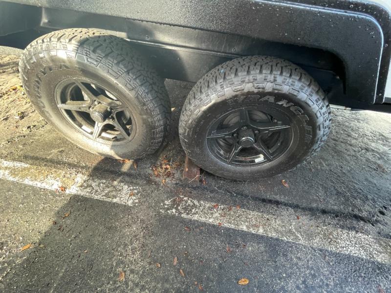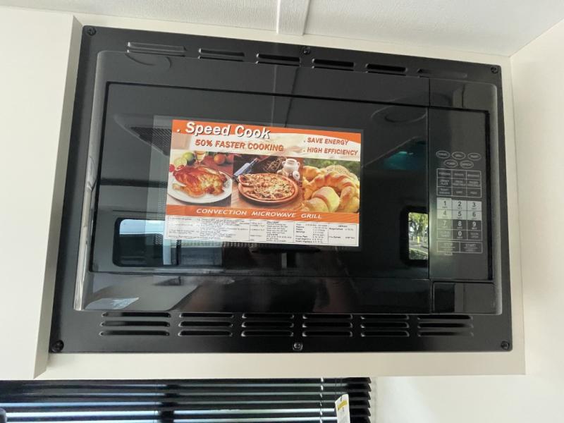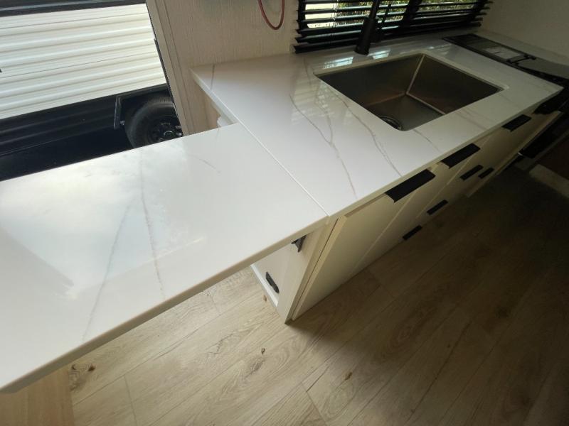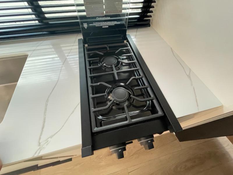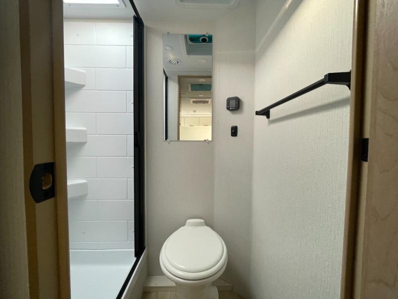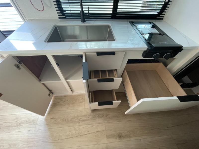 The fully equipped kitchen is designed for convenience on the road. With a two-burner cooktop, microwave, refrigerator, and ample countertop space, meal prep is easy and enjoyable. Plenty of storage ensures that all your cooking essentials are organized and accessible, whether you’re making a quick breakfast before heading out or preparing a full dinner after a day of adventure.
