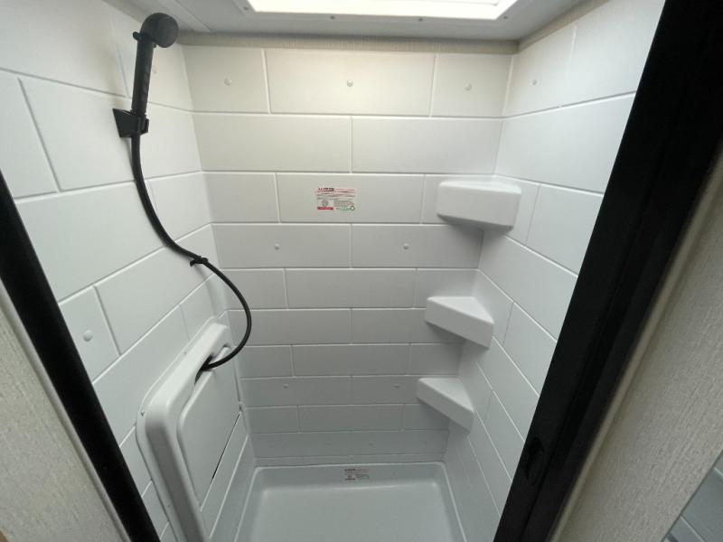 The bathroom is thoughtfully designed with a shower, toilet, and vanity, offering comfort and privacy wherever you travel. Durable materials, modern finishes, and practical storage throughout the Micro Minnie 2100BH enhance functionality and long-term enjoyment.