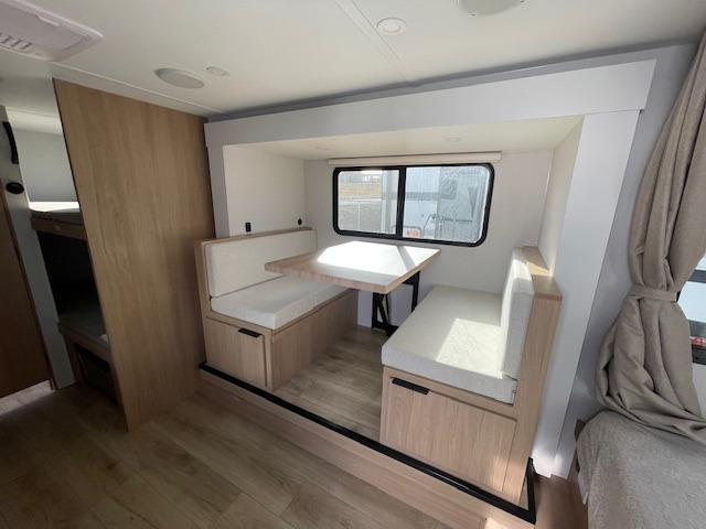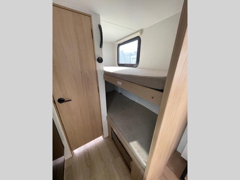 Get ready for a fun family weekend in the great outdoors with this trailer only steps away to enjoy inside comforts! The cook will love having everything to make warm meals, and can easily store leftovers in the 10.3 cu. ft. 12V refrigerator, plus the flip-up counter gives them more space to prep or dry the dishes. The front 54" x 74" full bed has a divider curtain for privacy at night and the rear corner 28" x 72" bunk beds are conveniently next to the private toilet and shower room. The booth dinette slide gives you a place to dine as well as sleep one more person, plus you will love the extra floor space that it provides. You might like to choose the EZ Glide Sofa Sleeper and table option in its place, the option is yours!