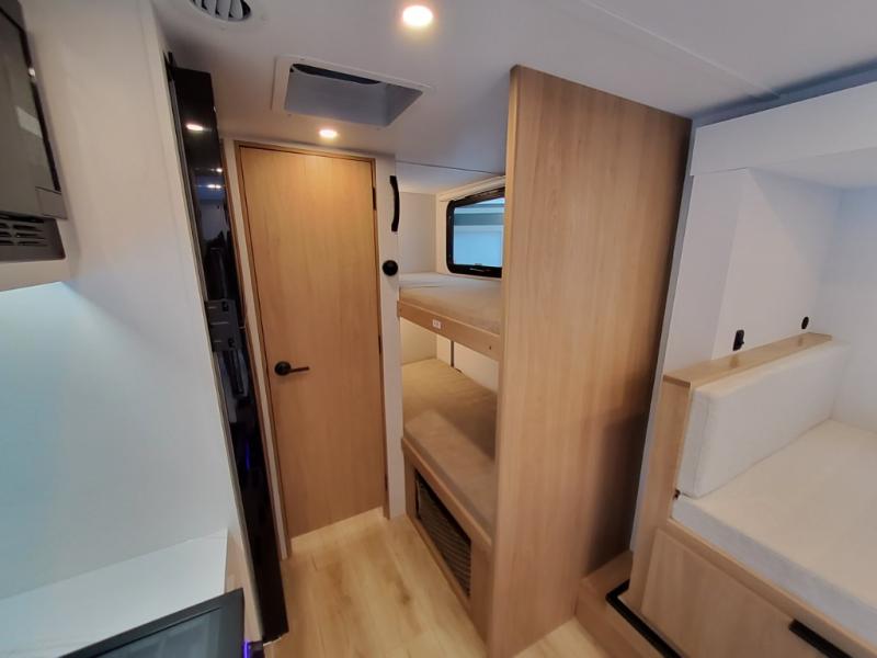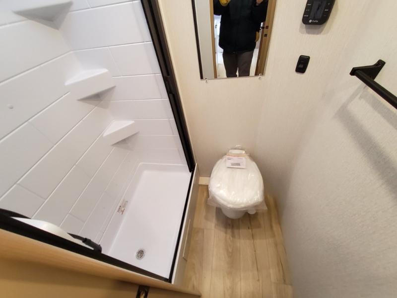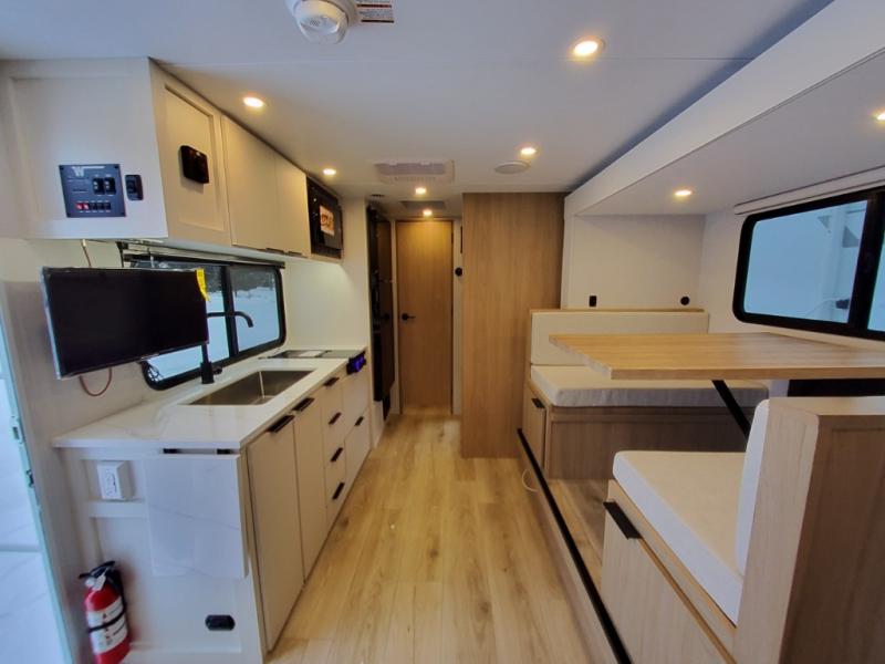 Get ready for a fun family weekend in the great outdoors with this trailer only steps away to enjoy inside comforts! The cook will love having everything to make warm meals, and can easily store leftovers in the 10.3 cu. ft. 12V refrigerator, plus the flip-up counter gives them more space to prep or dry the dishes. The front 54" x 74" full bed has a divider curtain for privacy at night and the rear corner 28" x 72" bunk beds are conveniently next to the private toilet and shower room. The booth dinette slide gives you a place to dine as well as sleep one more person, plus you will love the extra floor space that it provides. You might like to choose the EZ Glide Sofa Sleeper and table option in its place, the option is yours!