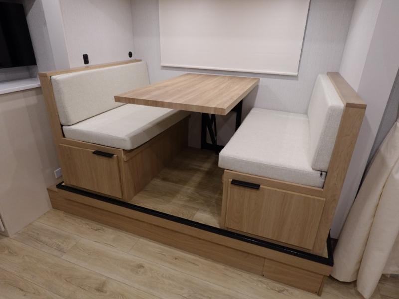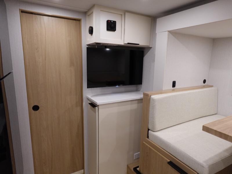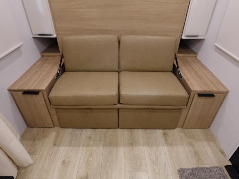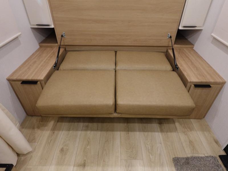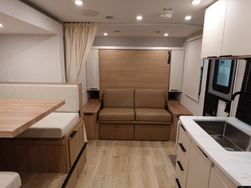 If you're looking for versatility then you need this travel trailer! Depending on the time of day you enter will determine whether you see the Murphy bed or the sofa up front. A slide out 44" x 72" booth dinette can be used for dining, playing games, and sleeping space at night. The full rear bathroom is equipped with everything you will need to freshen up each morning and features a wardrobe for your clothing and linens, and a pocket door into the bath saves space in the main room. The Smart TV is conveniently located so you can watch your favorite shows from the sofa or Murphy bed as well as the dinette, plus the pantry offers a place to store your snacks and such for easy access. The cook in your bunch will love all the amenities to make meals including the handy flip-up counter for more prep space.