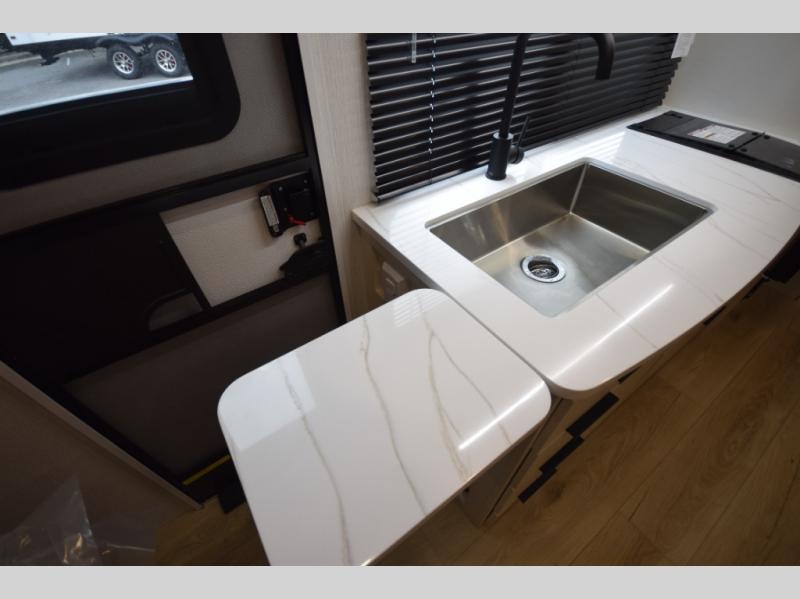 Whip up meals with ease thanks to a spacious galley kitchen featuring a cooktop, convection microwave oven, large sink, and a 10.3 cu. ft. 12V refrigerator. The slide-out booth dinette offers room to dine, work, or host game night, and converts into a sleeping space for guests when needed. A flip-up countertop extension adds extra prep space when you're in chef mode.