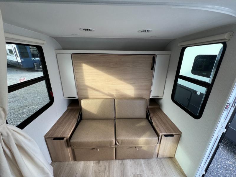If you're looking for versatility then you need this travel trailer! Depending on the time of day you enter will determine whether you see the Murphy bed or the sofa up front. A slide out 44" x 72" booth dinette can be used for dining, playing games, and sleeping space at night. The full rear bathroom is equipped with everything you will need to freshen up each morning and features a wardrobe for your clothing and linens, and a pocket door into the bath saves space in the main room. The Smart TV is conveniently located so you can watch your favorite shows from the sofa or Murphy bed as well as the dinette, plus the pantry offers a place to store your snacks and such for easy access. The cook in your bunch will love all the amenities to make meals including the handy flip-up counter for more prep space.