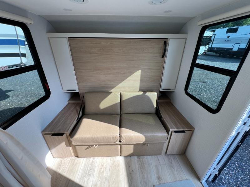If you're looking for versatility then you need this travel trailer! Depending on the time of day you enter will determine whether you see the Murphy bed or the sofa up front. A slide out 44" x 72" booth dinette can be used for dining, playing games, and sleeping space at night. The full rear bathroom is equipped with everything you will need to freshen up each morning and features a wardrobe for your clothing and linens, and a pocket door into the bath saves space in the main room. The Smart TV is conveniently located so you can watch your favorite shows from the sofa or Murphy bed as well as the dinette, plus the pantry offers a place to store your snacks and such for easy access. The cook in your bunch will love all the amenities to make meals including the handy flip-up counter for more prep space.