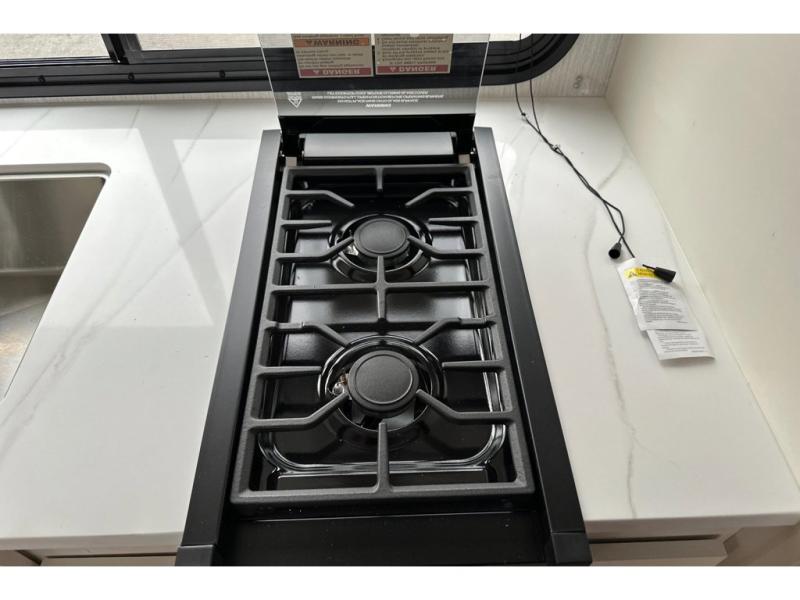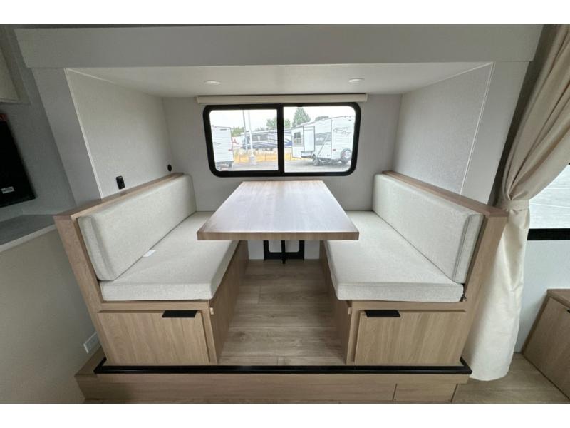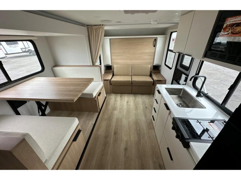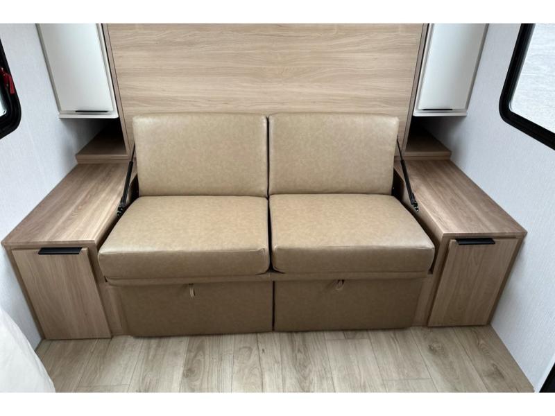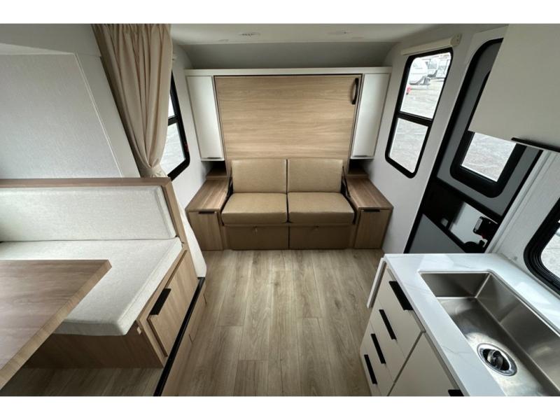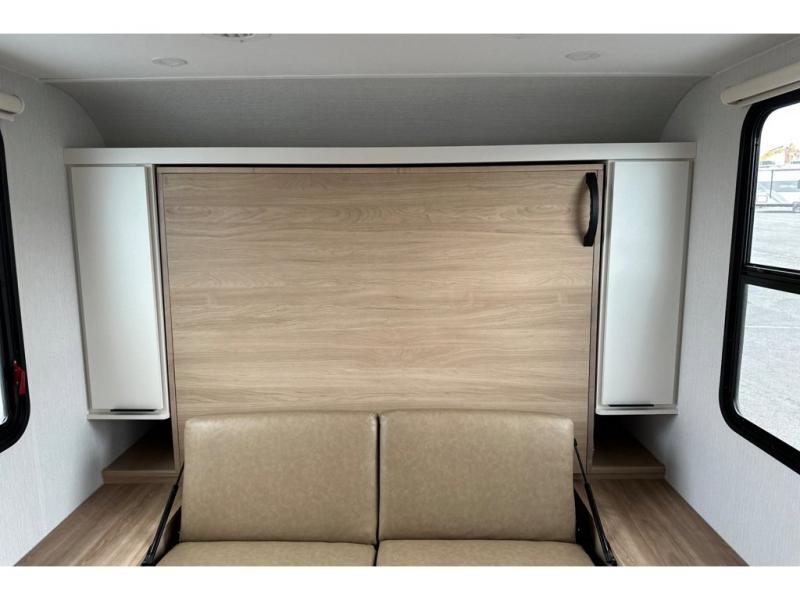 If you're looking for versatility then you need this travel trailer! Depending on the time of day you enter will determine whether you see the Murphy bed or the sofa up front. A slide out 44" x 72" booth dinette can be used for dining, playing games, and sleeping space at night. The full rear bathroom is equipped with everything you will need to freshen up each morning and features a wardrobe for your clothing and linens, and a pocket door into the bath saves space in the main room. The Smart TV is conveniently located so you can watch your favorite shows from the sofa or Murphy bed as well as the dinette, plus the pantry offers a place to store your snacks and such for easy access. The cook in your bunch will love all the amenities to make meals including the handy flip-up counter for more prep space.