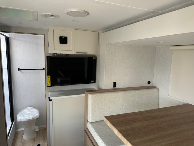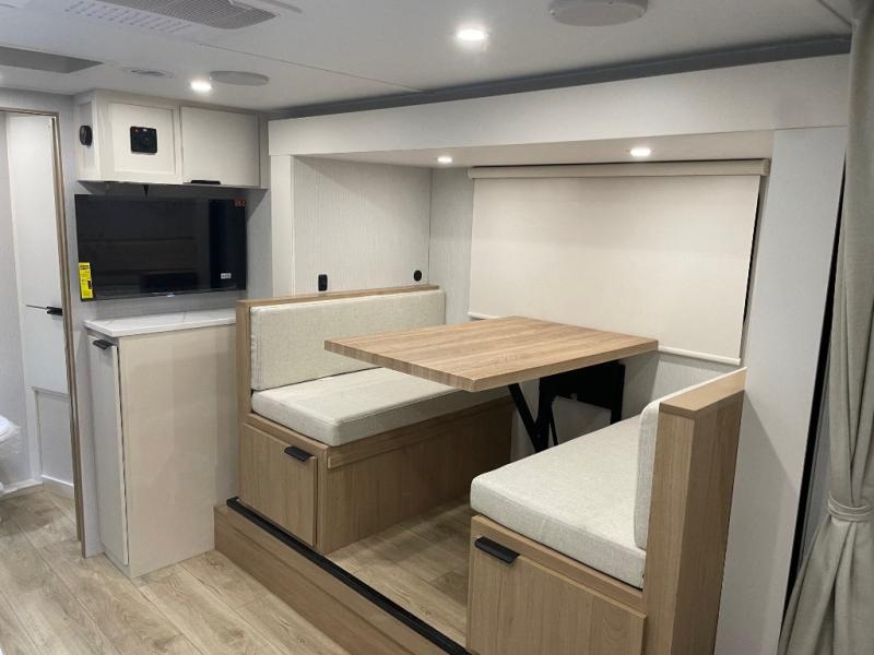 If you're looking for versatility then you need this travel trailer! Depending on the time of day you enter will determine whether you see the Murphy bed or the sofa up front. A slide out 44" x 72" booth dinette can be used for dining, playing games, and sleeping space at night. The full rear bathroom is equipped with everything you will need to freshen up each morning and features a wardrobe for your clothing and linens, and a pocket door into the bath saves space in the main room. The Smart TV is conveniently located so you can watch your favorite shows from the sofa or Murphy bed as well as the dinette, plus the pantry offers a place to store your snacks and such for easy access. The cook in your bunch will love all the amenities to make meals including the handy flip-up counter for more prep space.