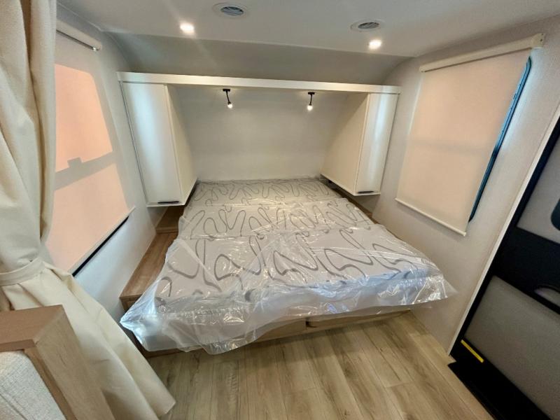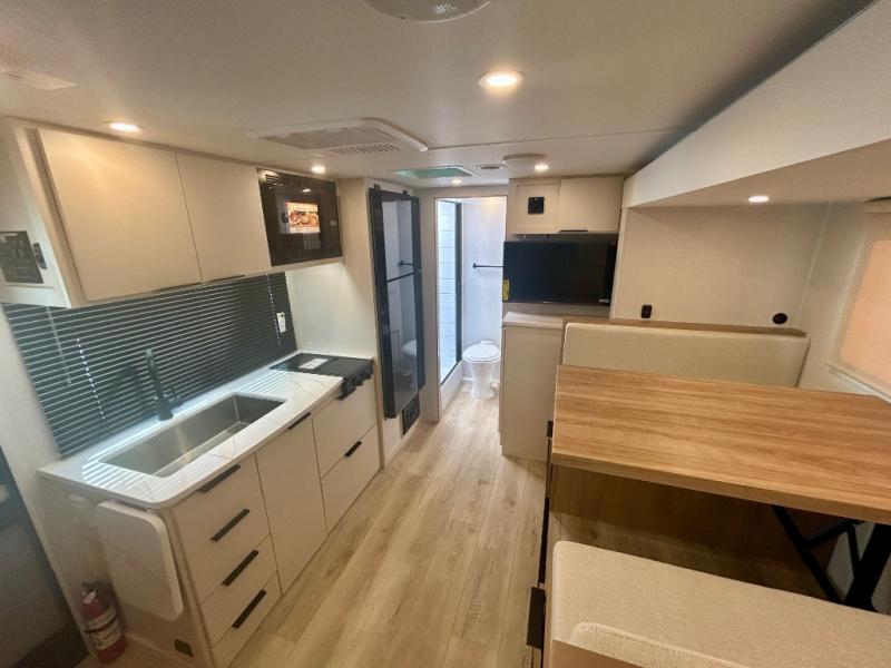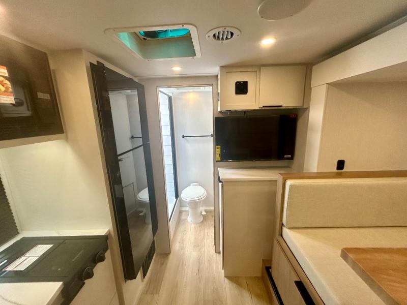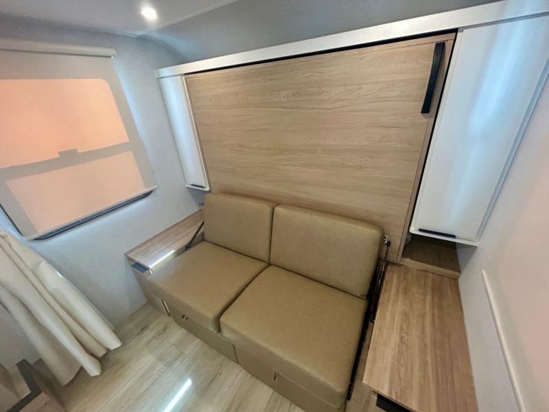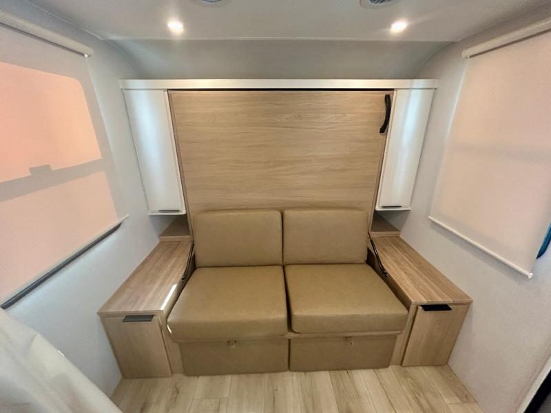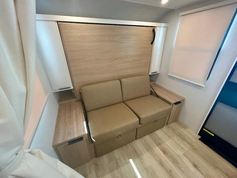 If you're looking for versatility then you need this travel trailer! Depending on the time of day you enter will determine whether you see the Murphy bed or the sofa up front. A slide out 44" x 72" booth dinette can be used for dining, playing games, and sleeping space at night. The full rear bathroom is equipped with everything you will need to freshen up each morning and features a wardrobe for your clothing and linens, and a pocket door into the bath saves space in the main room. The Smart TV is conveniently located so you can watch your favorite shows from the sofa or Murphy bed as well as the dinette, plus the pantry offers a place to store your snacks and such for easy access. The cook in your bunch will love all the amenities to make meals including the handy flip-up counter for more prep space.