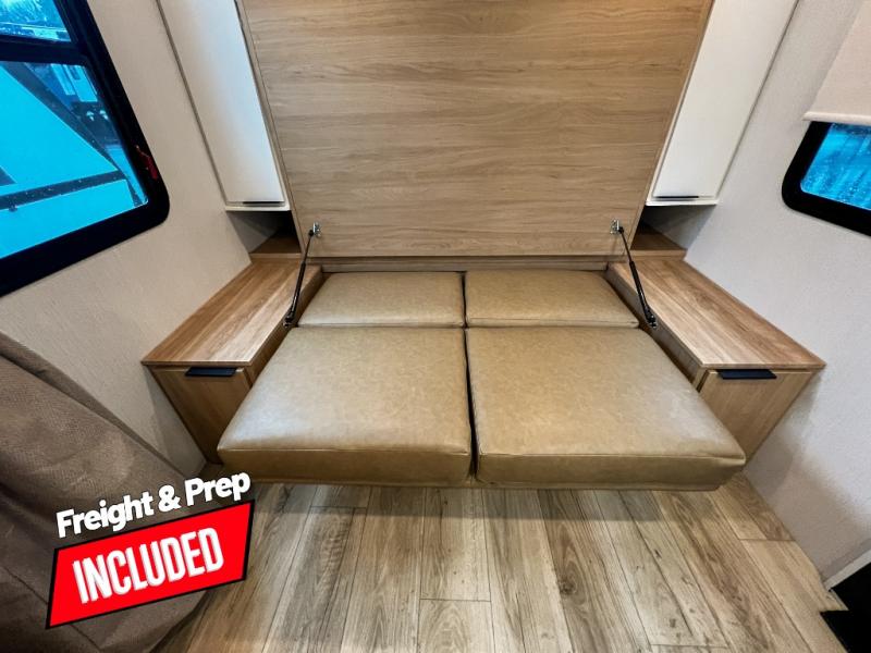 If you're looking for versatility, then you need this travel trailer! Depending on the time of day you enter will determine whether you see the Murphy bed or the sofa up front. A slide out 44" x 72" booth dinette can be used for dining, playing games, and sleeping space at night. The full rear bathroom is equipped with everything you will need to freshen up each morning and features a wardrobe for your clothing and linens, and a pocket door into the bath saves space in the main room. The Smart TV is conveniently located so you can watch your favorite shows from the sofa or Murphy bed as well as the dinette, plus the pantry offers a place to store your snacks and such for easy access. The cook in your bunch will love all the amenities to make meals including the handy flip-up counter for more prep space.