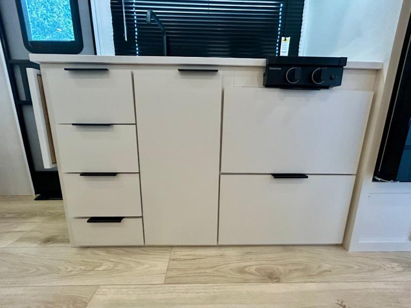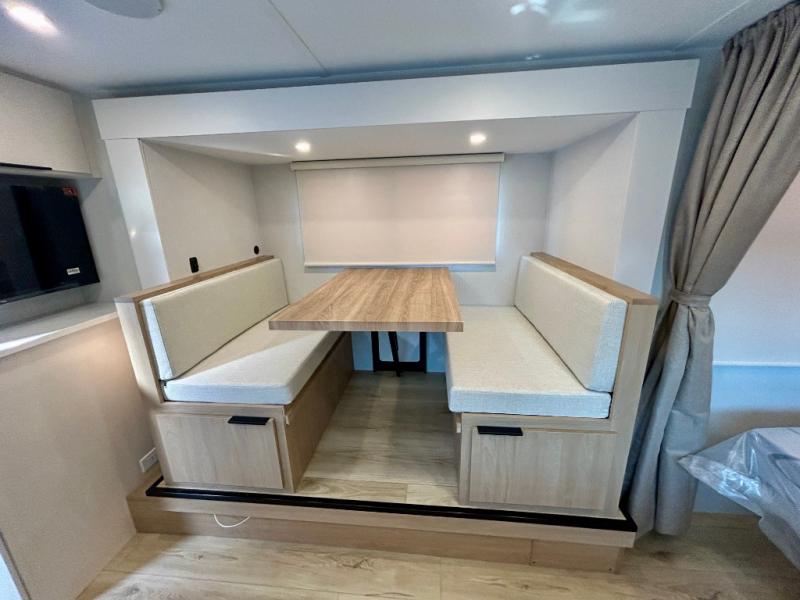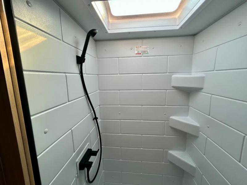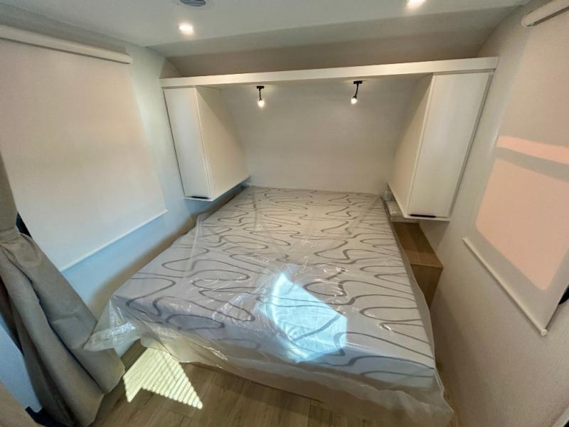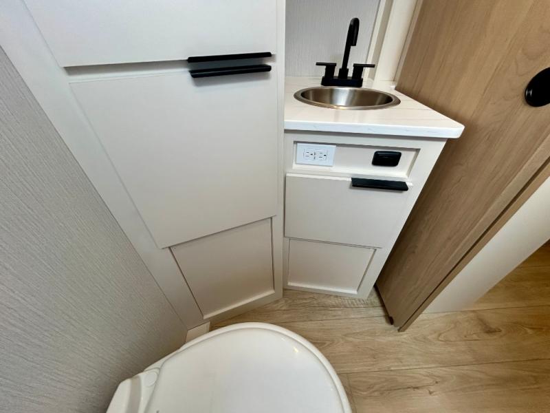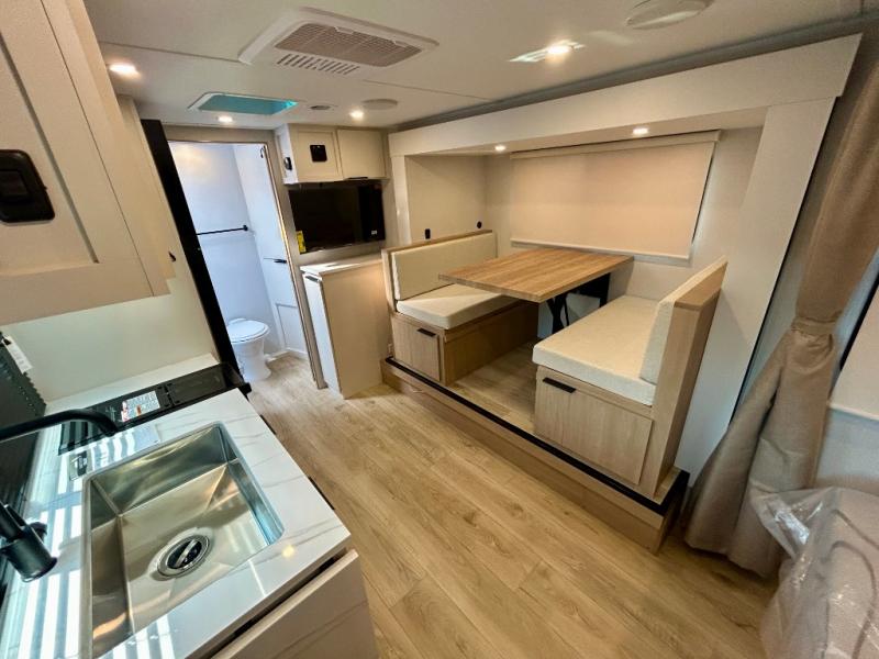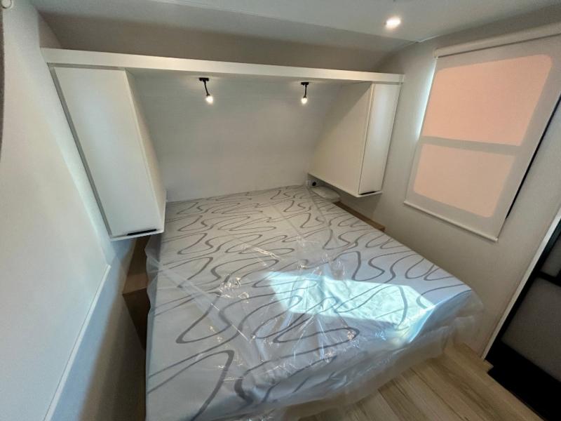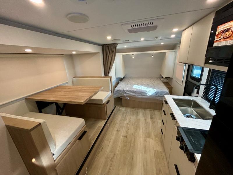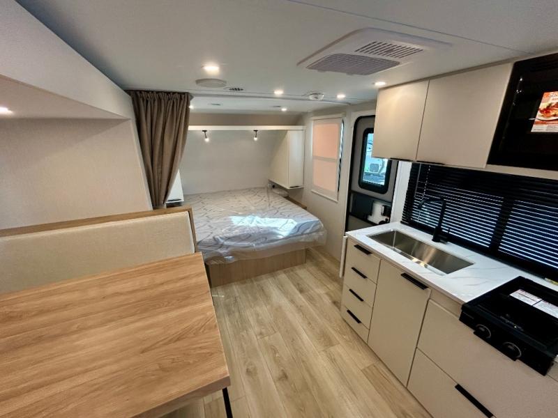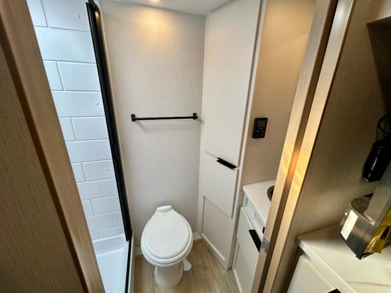 Pack your bags and head to the campground with this travel trailer! You will love all that it has to offer from the full rear bathroom to the front 60" x 74" RV queen-size bed with dual wardrobes on either side of the bed. The 44" x 72" booth dinette slide is not only a great place to enjoy your meals at or play card games, but it can also be transformed into an extra sleeping space if you want to bring along a guest. When you don't feel like making dinner, you can easily pop in some leftovers or a bag of popcorn into the convection microwave and relax while you watch a movie on the Smart TV!