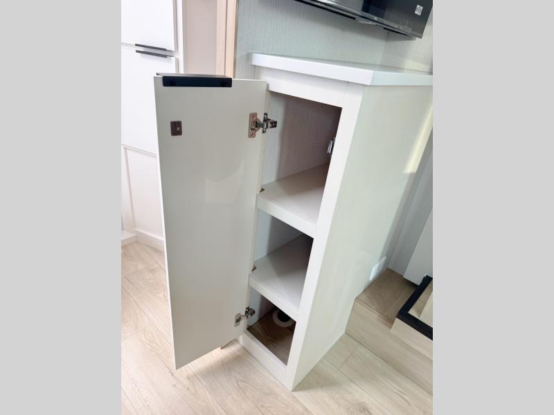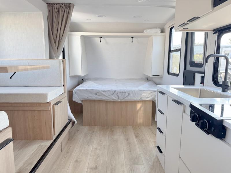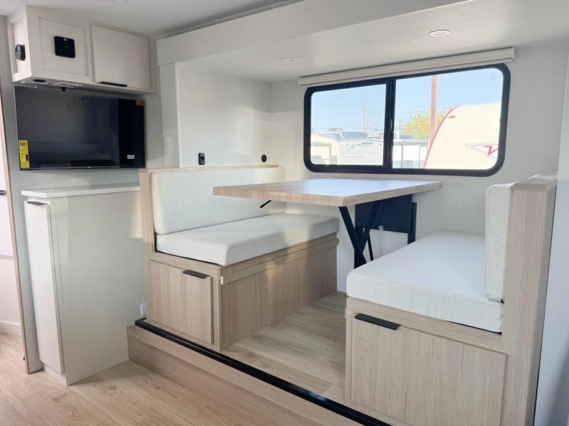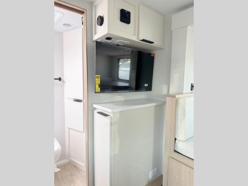 Pack your bags and head to the campground with this travel trailer! You will love all that it has to offer from the full rear bathroom to the front 60" x 74" RV queen-size bed with dual wardrobes on either side of the bed. The 44" x 72" booth dinette slide is not only a great place to enjoy your meals at or play card games, but it can also be transformed into an extra sleeping space if you want to bring along a guest. When you don't feel like making dinner, you can easily pop in some leftovers or a bag of popcorn into the convection microwave and relax while you watch a movie on the Smart TV!
