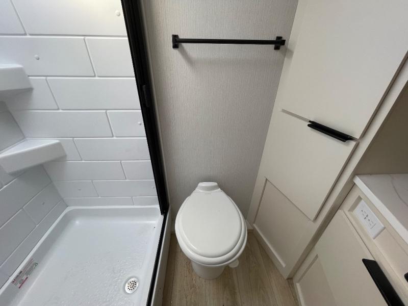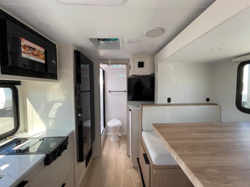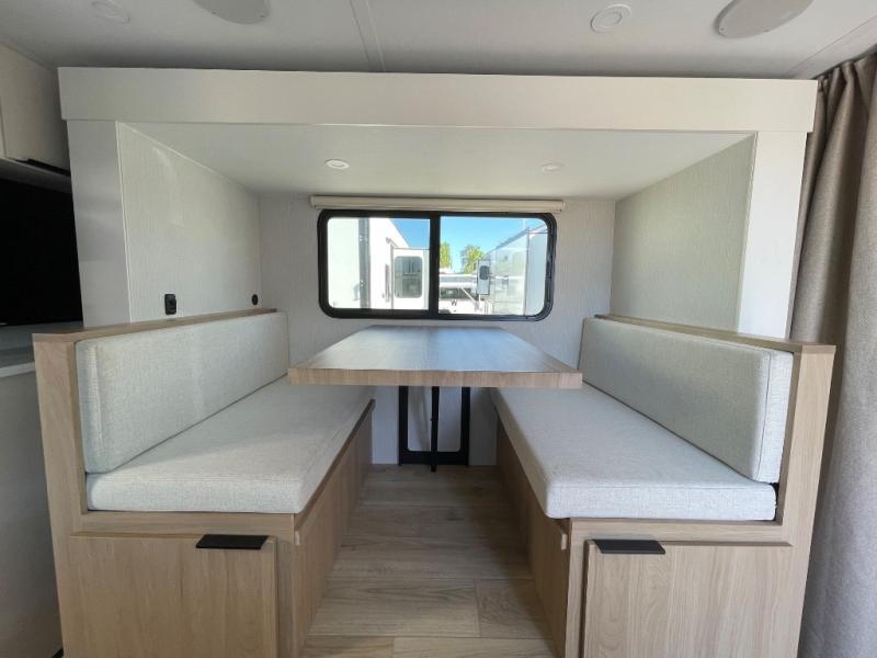 Pack your bags and head to the campground with this travel trailer! You will love all that it has to offer from the full rear bathroom to the front 60" x 74" RV queen-size bed with dual wardrobes on either side of the bed. The 44" x 72" booth dinette slide is not only a great place to enjoy your meals at or play card games, but it can also be transformed into an extra sleeping space if you want to bring along a guest. When you don't feel like making dinner, you can easily pop in some leftovers or a bag of popcorn into the convection microwave and relax while you watch a movie on the Smart TV!