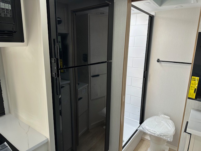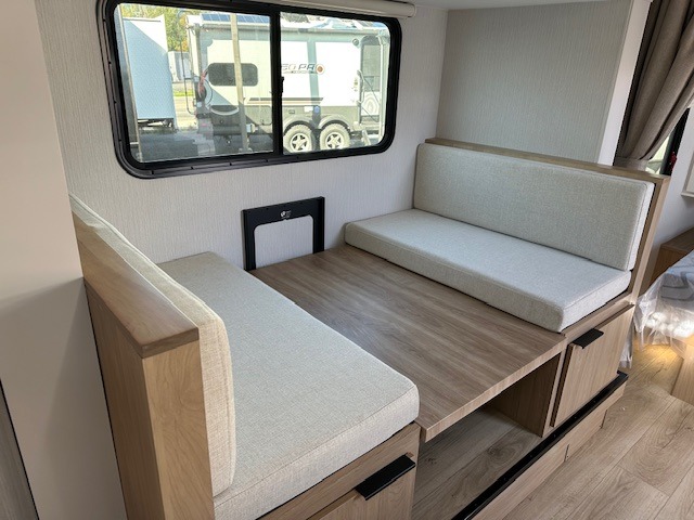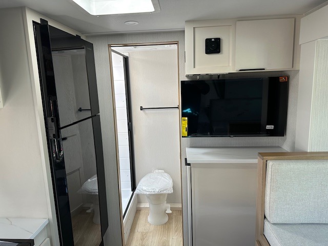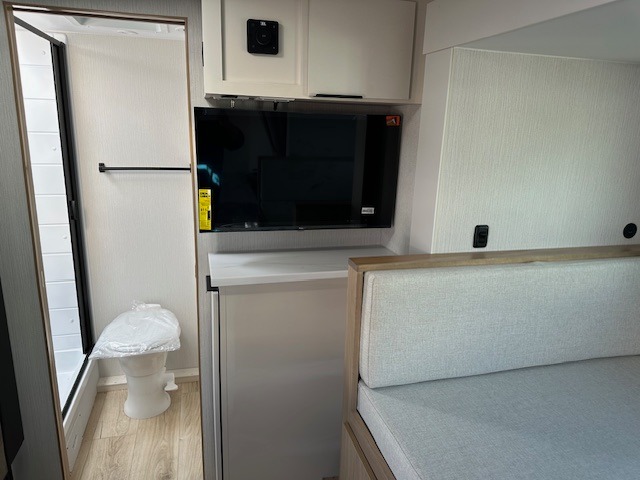 Pack your bags and head to the campground with this travel trailer! You will love all that it has to offer from the full rear bathroom to the front 60" x 74" RV queen-size bed with dual wardrobes on either side of the bed. The 44" x 72" booth dinette slide is not only a great place to enjoy your meals at or play card games, but it can also be transformed into an extra sleeping space if you want to bring along a guest. When you don't feel like making dinner, you can easily pop in some leftovers or a bag of popcorn into the convection microwave and relax while you watch a movie on the Smart TV!