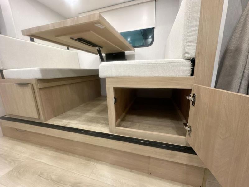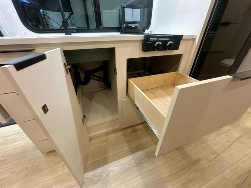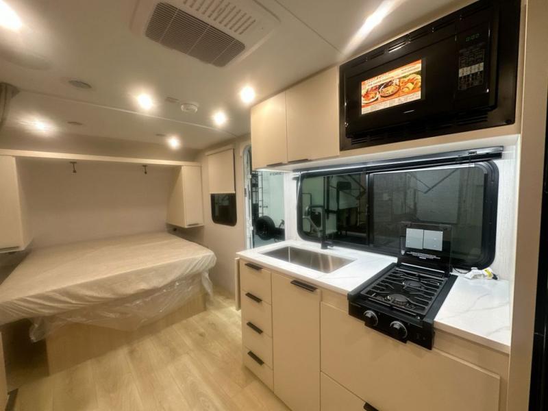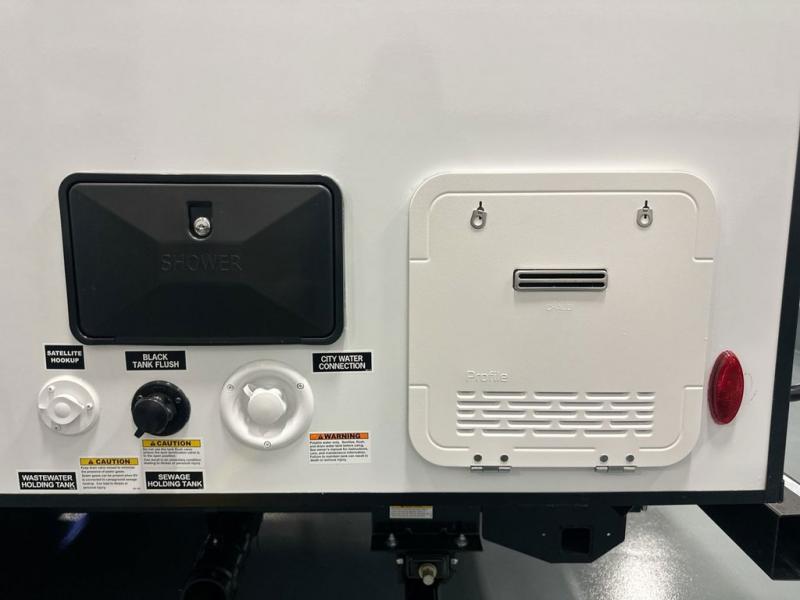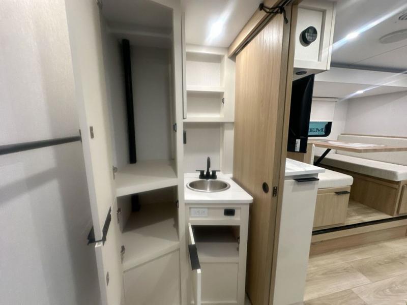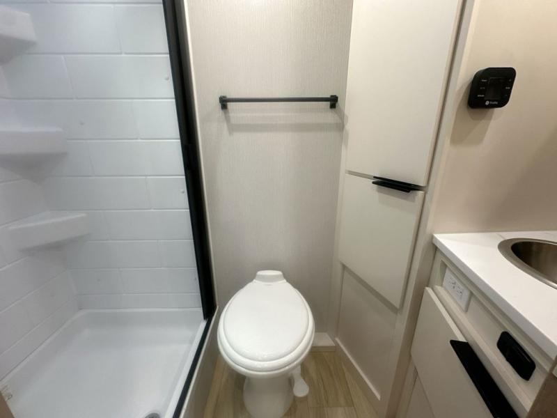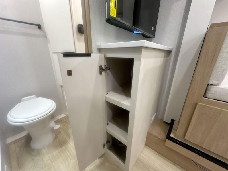 Pack your bags and head to the campground with this travel trailer! You will love all that it has to offer from the full rear bathroom to the front 60" x 74" RV queen-size bed with dual wardrobes on either side of the bed. The 44" x 72" booth dinette slide is not only a great place to enjoy your meals at or play card games, but it can also be transformed into an extra sleeping space if you want to bring along a guest. When you don't feel like making dinner, you can easily pop in some leftovers or a bag of popcorn into the convection microwave and relax while you watch a movie on the Smart TV!