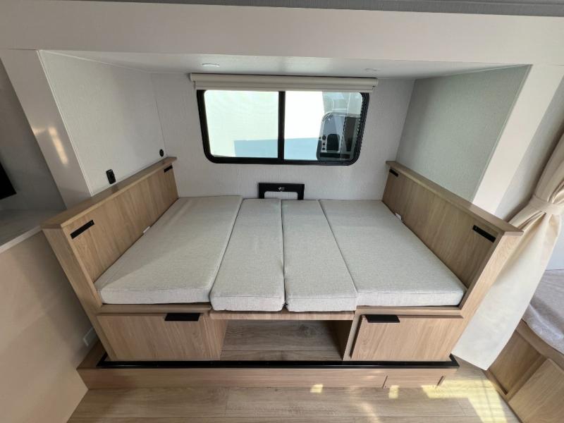 Come see just how accommodating this travel trailer can be! The two 32" x 74" twin beds up front have a nightstand in between them and a divider curtain to draw, plus they can convert into one 74" x 82" king-size bed. The 44" x 72" booth dinette slide can also convert into an extra sleeping space when you're not using it for meal time or playing games. Everyone can get squeaky clean in the full rear bathroom, and the wardrobe is a convenient place to store your linens and extra clothes. Grab a snack from the kitchen pantry or pop a bag of popcorn in the convection microwave then watch a movie on the Smart TV or head outdoors and relax underneath the power awning!