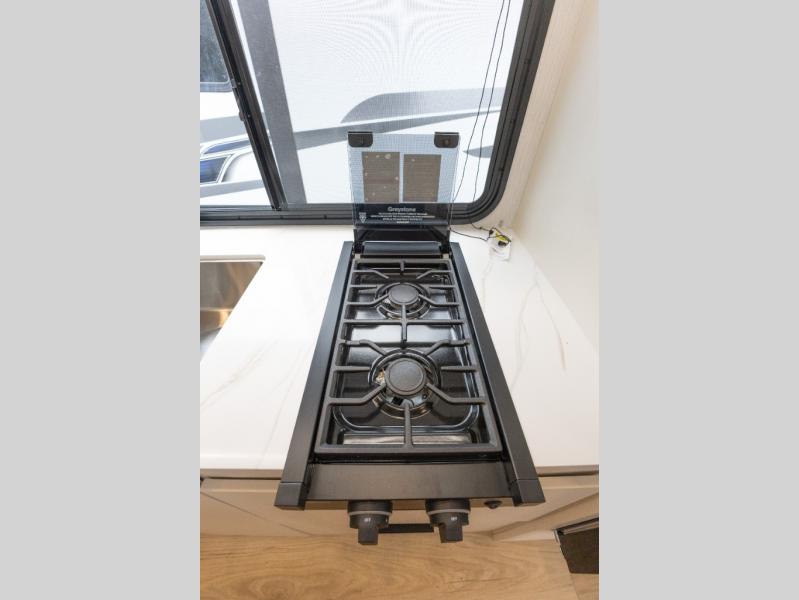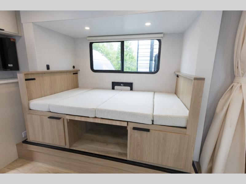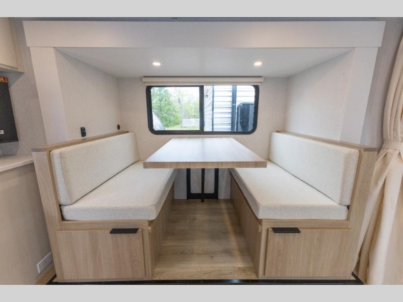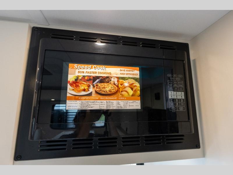 Come see just how accommodating this travel trailer can be! The two 32" x 74" twin beds up front have a nightstand in between them and a divider curtain to draw, plus they can convert into one 74" x 82" king-size bed. The 44" x 72" booth dinette slide can also convert into an extra sleeping space when you're not using it for meal time or playing games. Everyone can get squeaky clean in the full rear bathroom, and the wardrobe is a convenient place to store your linens and extra clothes. Grab a snack from the kitchen pantry or pop a bag of popcorn in the convection microwave then watch a movie on the Smart TV or head outdoors and relax underneath the power awning!