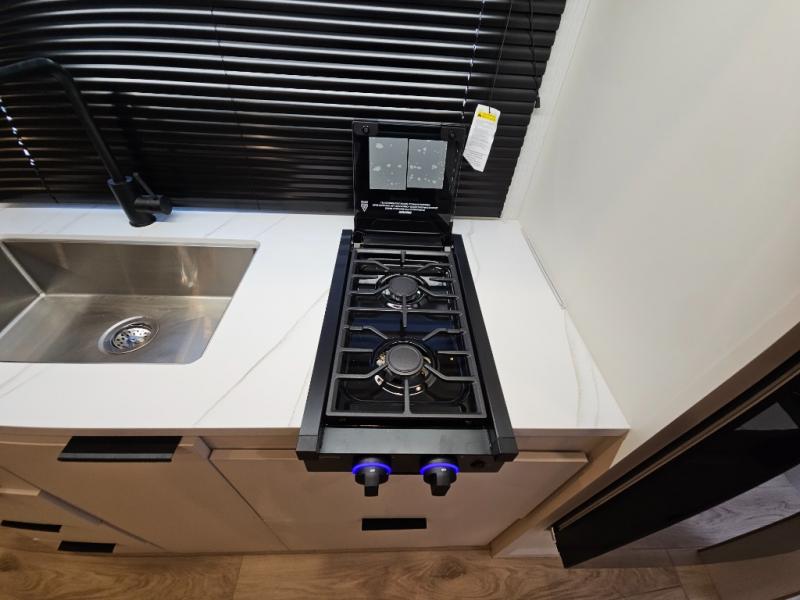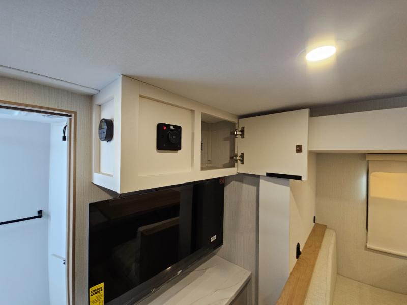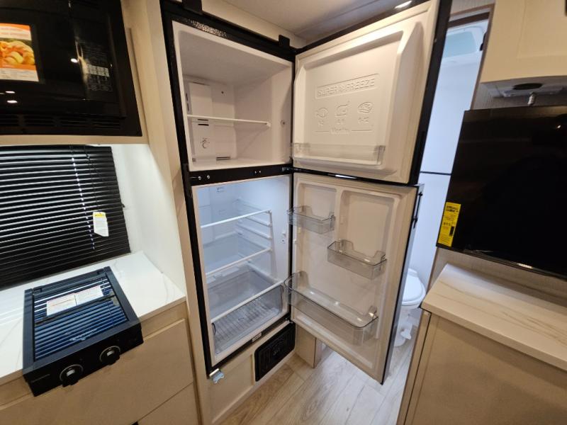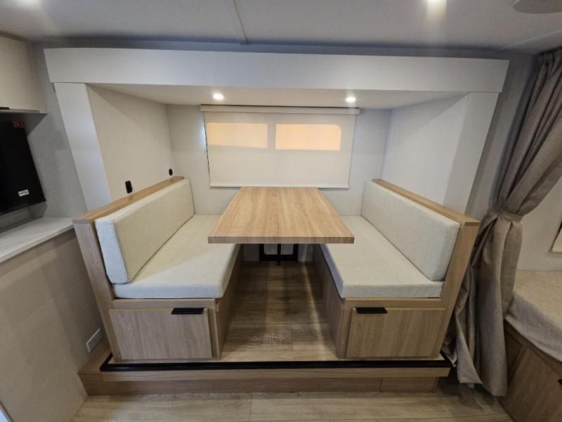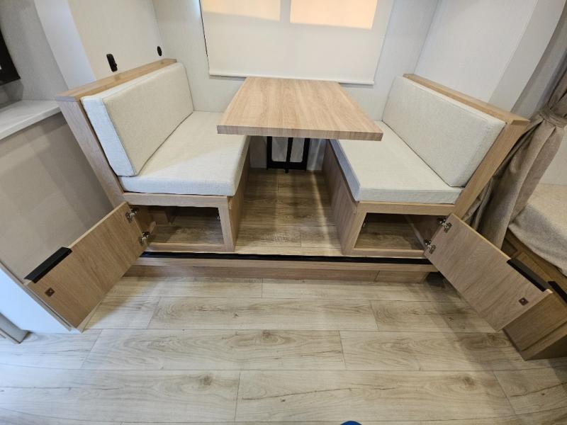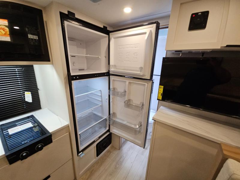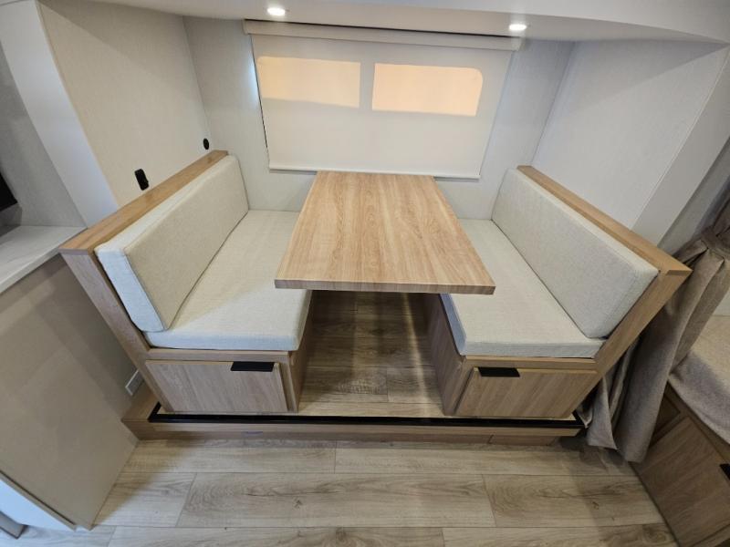 Come see just how accommodating this travel trailer can be! The two 32" x 74" twin beds up front have a nightstand in between them and a divider curtain to draw, plus they can convert into one 74" x 82" king-size bed. The 44" x 72" booth dinette slide can also convert into an extra sleeping space when you're not using it for meal time or playing games. Everyone can get squeaky clean in the full rear bathroom, and the wardrobe is a convenient place to store your linens and extra clothes. Grab a snack from the kitchen pantry or pop a bag of popcorn in the convection microwave then watch a movie on the Smart TV or head outdoors and relax underneath the power awning!