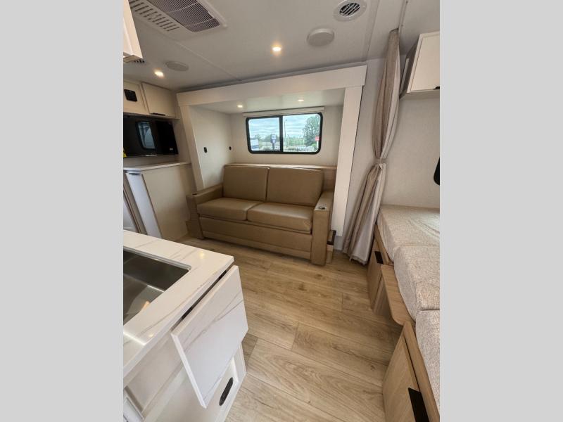 Start out on your boundless journey in one of these Winnebago Micro Minnie travel trailers! Towing is made simple with the 7' width to keep your Micro Minnie in your rear-view mirror. They don't lack in features either although they are compact in size. The spacious galley including a sink, refrigerator, a cooktop, and even a convection microwave oven allows you to cook without compromise. You will not only enjoy the entertainment found indoors with a Smart TV, a JBL premium sound system and Aura Cube high performance mechless media center, but outdoors you will also enjoy the JBL premium speakers and a power awning with LED lighting. Each model also comes with flexible exterior storage to make packing quick and easy, a 200-watt solar panel for off-grid camping, and Dexter TORFLEX torsion stub axles for smooth towing!