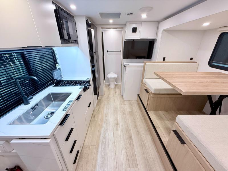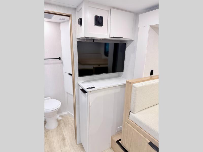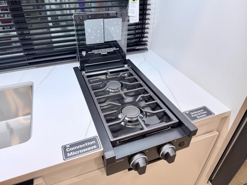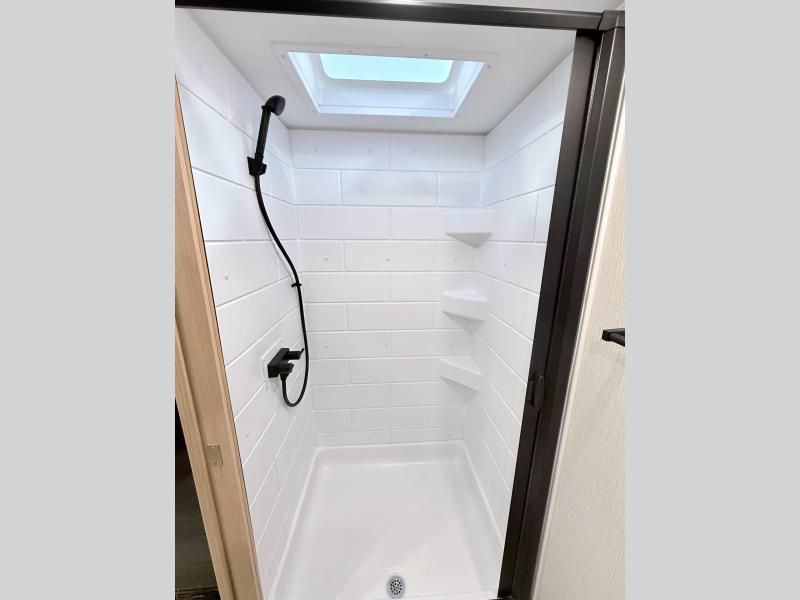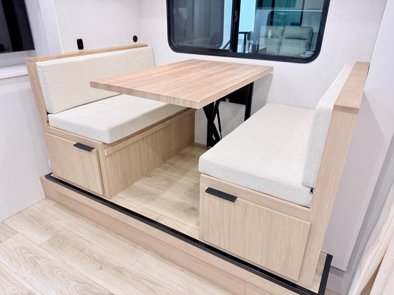 Come see just how accommodating this travel trailer can be! The two 32" x 74" twin beds up front have a nightstand in between them and a divider curtain to draw, plus they can convert into one 74" x 82" king-size bed. The 44" x 72" booth dinette slide can also convert into an extra sleeping space when you're not using it for meal time or playing games. Everyone can get squeaky clean in the full rear bathroom, and the wardrobe is a convenient place to store your linens and extra clothes. Grab a snack from the kitchen pantry or pop a bag of popcorn in the convection microwave then watch a movie on the Smart TV or head outdoors and relax underneath the power awning!