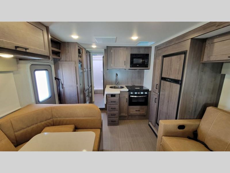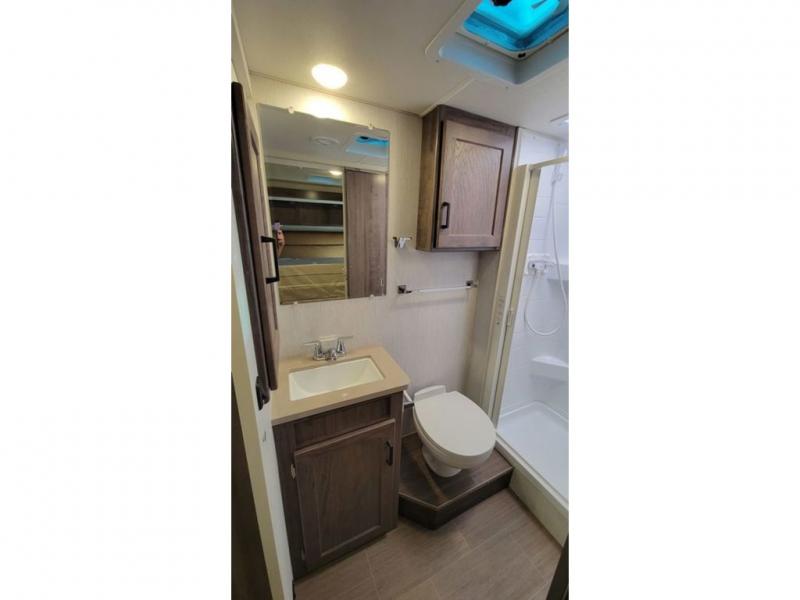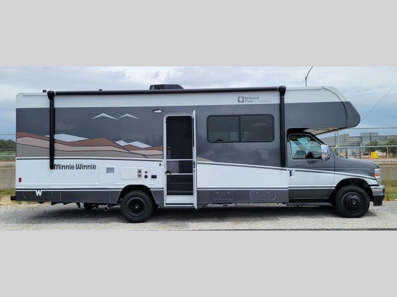 Explore the beautiful national parks with the Minnie Winnie NPF Limited Edition Class A gas motorhome by Winnebago. The compact build is designed to fit most park campsites, and you're sure to turn heads with the exclusive National Park themed deluxe exterior graphics. You will also appreciate the large lighted trunk storage compartment for your camp gear, a powered awning with LED lighting, plus 240-watts of solar power for off-grid capabilities. You can stay connected wherever you roam with the radio/review monitor system that includes a 10" multi-function touchscreen monitor and rear camera, Bluetooth, and more! There is space for everyone inside to relax in comfort, including sleeping for six, and the galley kitchen will let you create your best home-cooked meals. This coach also includes vinyl flooring throughout, Corian solid surface countertops, plus a flexible showerhead and a bath skylight to name a few comforts!
