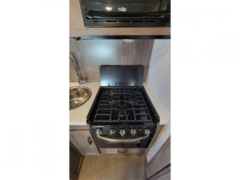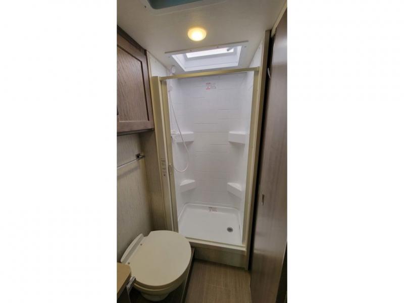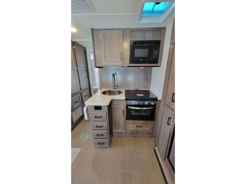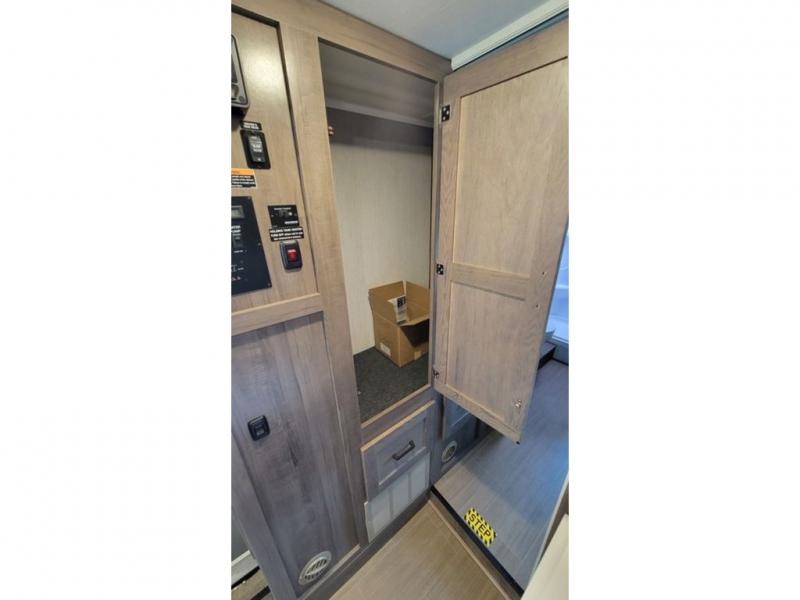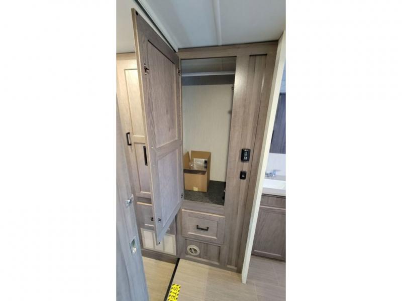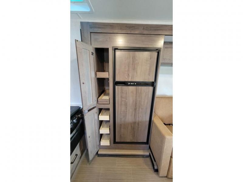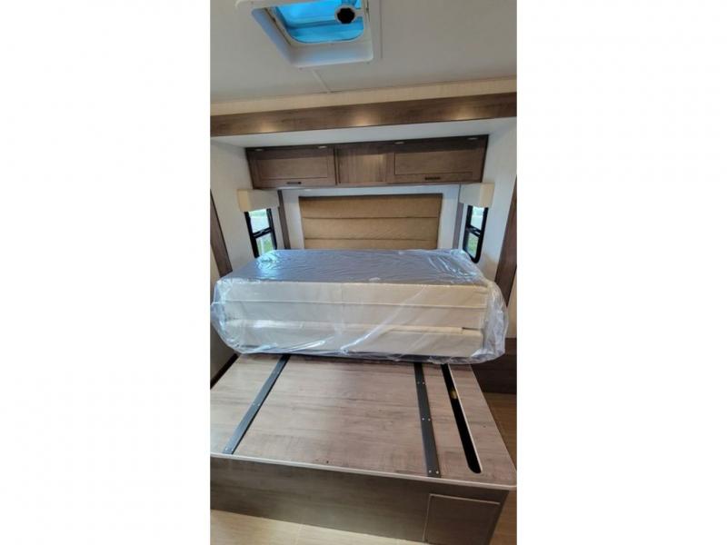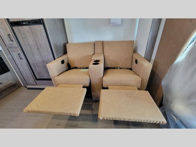 Time spent in this spacious coach will be time well spent! Whether you're dining around the U-shaped dinette, relaxing on the sofa bed, or visiting outdoors under the power awning, you're sure to have a great time. The cab-over bunk and the living room furniture will provide sleeping space for guests, and if don't have a lot of overnight guests, just choose the optional theater seating in place of the sofa bed. A three burner range and a microwave oven will let you prepare your best meals while you're on the road, plus there is an 8 cu. ft. 2-way large double door refrigerator/freezer and pantry for food storage. After a long day outdoors exploring trails, you can relax in the private bedroom on the RV queen bed slide. There are dual bedside nightstands for your things, a sliding door for more space, plus quick access into the rear corner full bath!