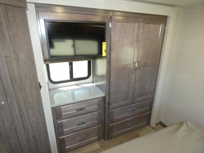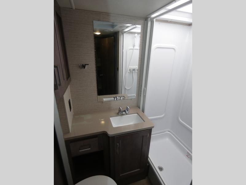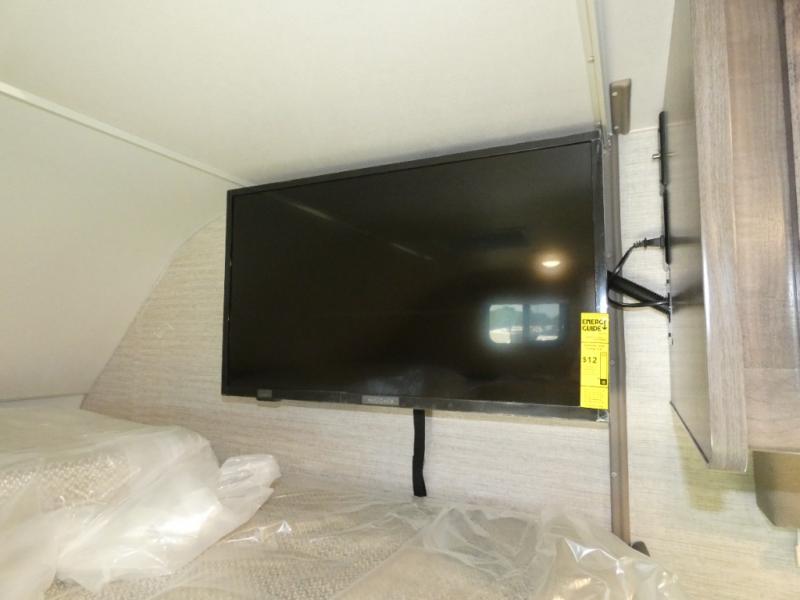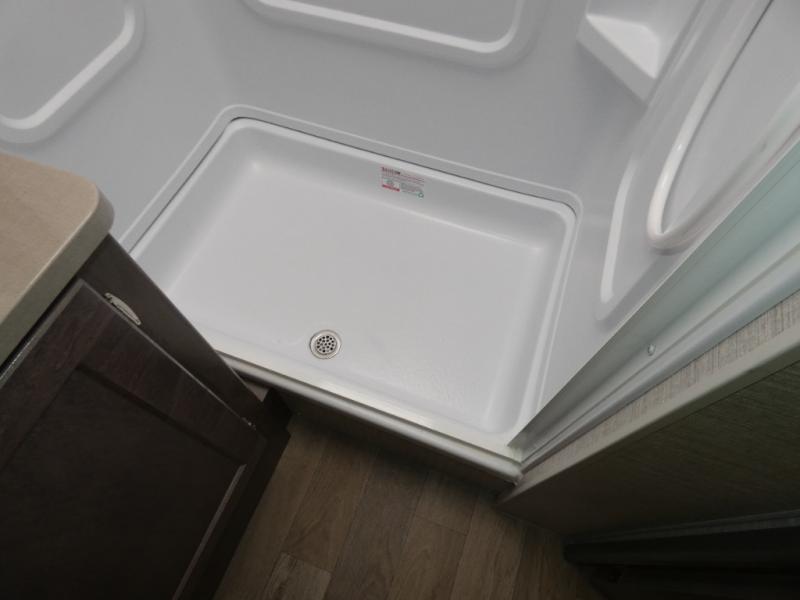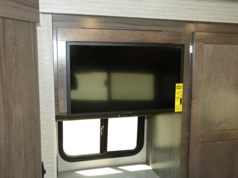 Enjoy plenty of interior space with two slides in this motorhome! The kids will love having a set of 30" x 73" bunk beds to sleep on at night and there is also a 57" x 95" bunk over cab, a 40" x 70" sofa bed, and a 45" x 74" U-shaped dinette that can be transformed for more friends to tag along. The rear private bedroom has a 60" x 75" queen bed with shirt closets and nightstands on either side, a wardrobe, and a chest of drawers with a 32" HDTV for your entertainment. Everyone can stay squeaky clean with the 26" x 38" shower with a skylight for added headroom and natural lighting in the full bathroom!