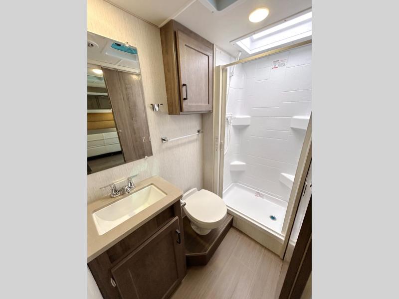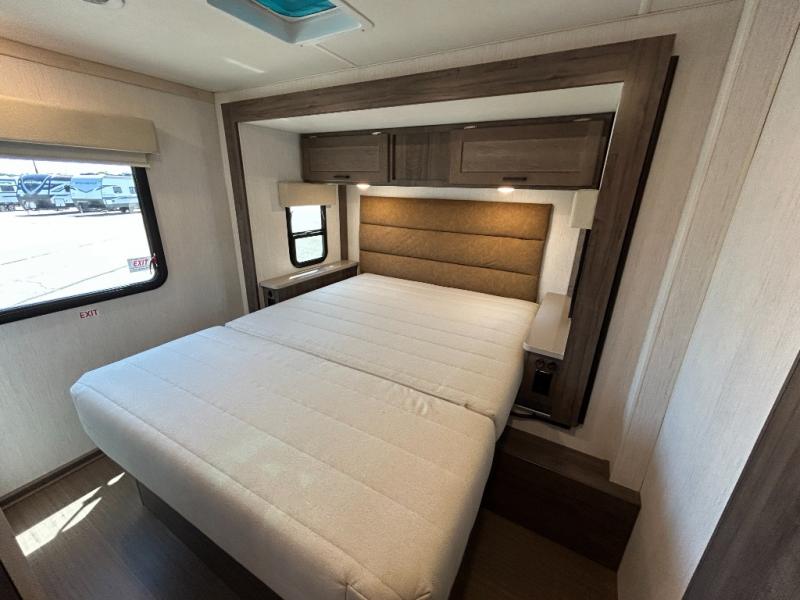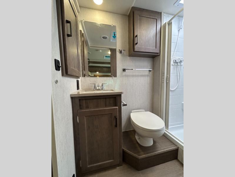 Time spent in this spacious coach will be time well spent! Whether you're dining around the U-shaped dinette, relaxing on the sofa bed, or visiting outdoors under the power awning, you're sure to have a great time. The cab-over bunk and the living room furniture will provide sleeping space for guests, and if don't have a lot of overnight guests, just choose the optional theater seating in place of the sofa bed. A three burner range and a microwave oven will let you prepare your best meals while you're on the road, plus there is an 8 cu. ft. 2-way large double door refrigerator/freezer and pantry for food storage. After a long day outdoors exploring trails, you can relax in the private bedroom on the RV queen bed slide. There are dual bedside nightstands for your things, a sliding door for more space, plus quick access into the rear corner full bath!