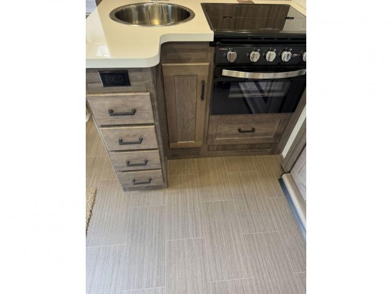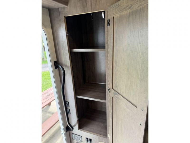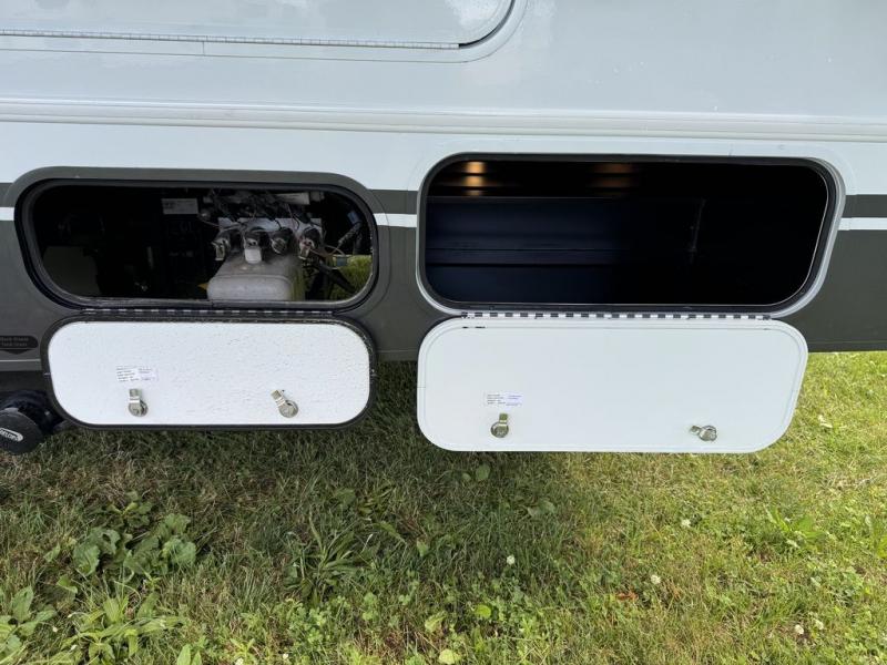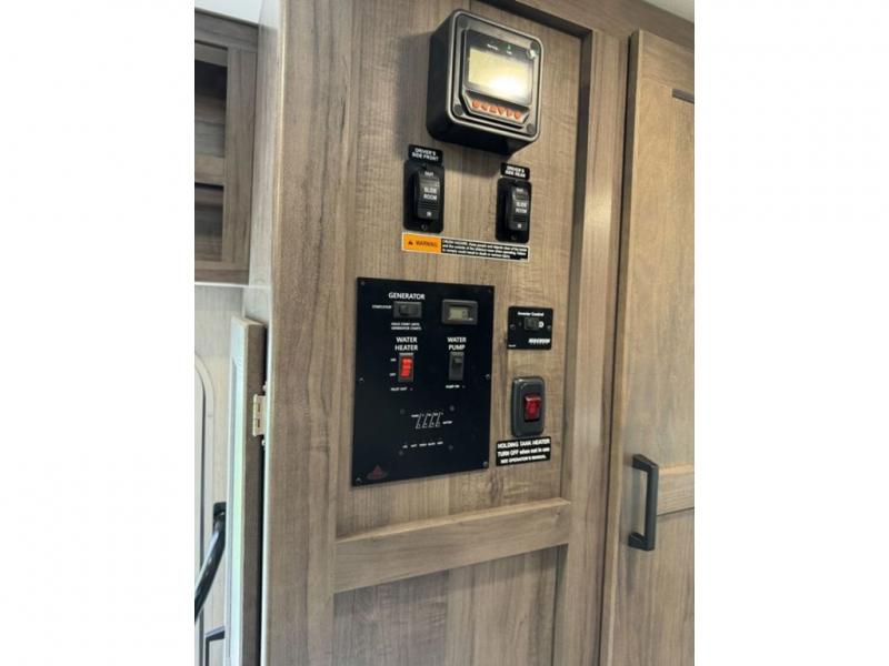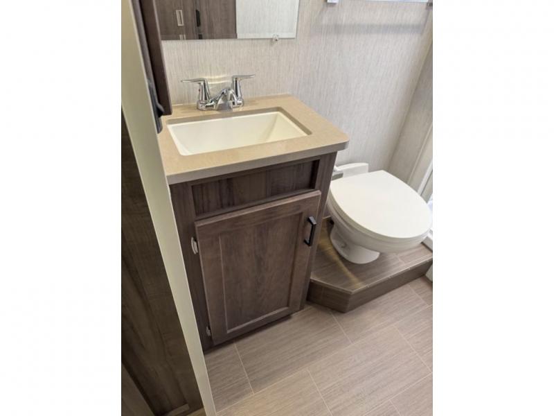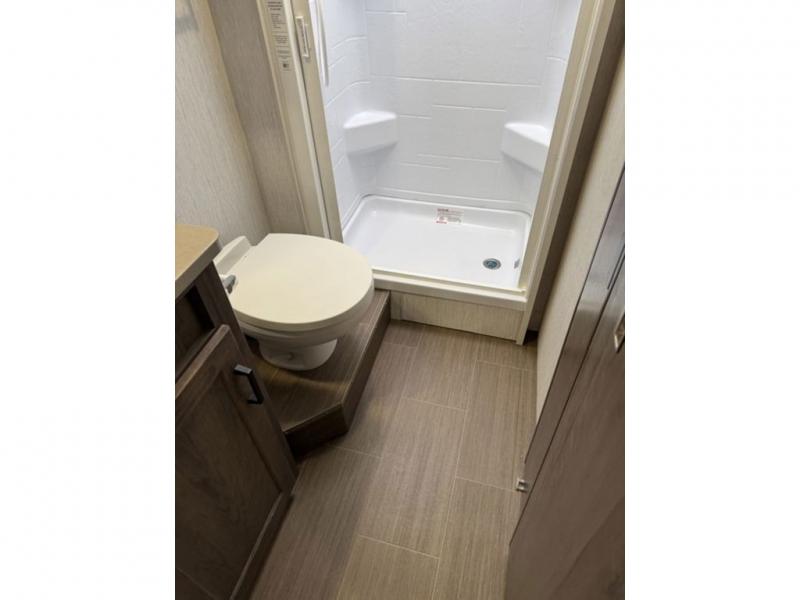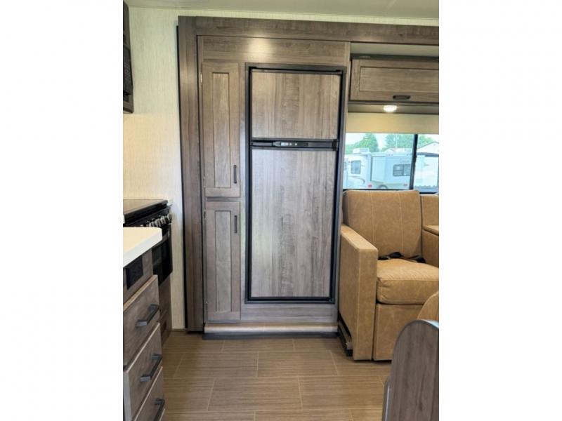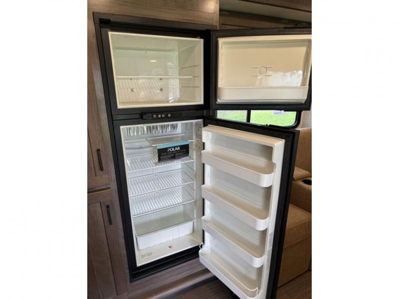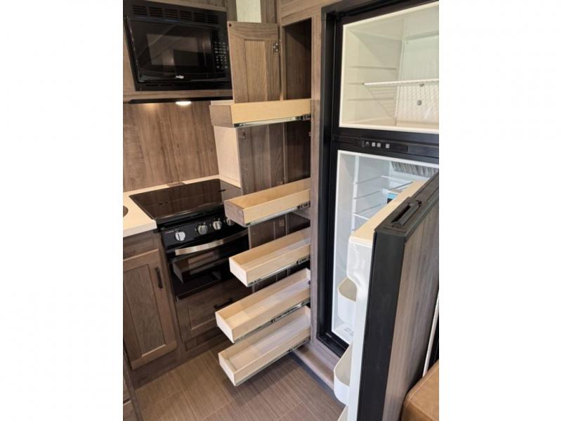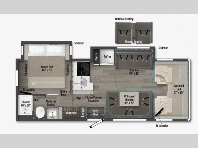 Time spent in this spacious coach will be time well spent! Whether you're dining around the U-shaped dinette, relaxing on the sofa bed, or visiting outdoors under the power awning, you're sure to have a great time. The cab-over bunk and the living room furniture will provide sleeping space for guests, and if don't have a lot of overnight guests, just choose the optional theater seating in place of the sofa bed. A three burner range and a microwave oven will let you prepare your best meals while you're on the road, plus there is an 8 cu. ft. 2-way large double door refrigerator/freezer and pantry for food storage. After a long day outdoors exploring trails, you can relax in the private bedroom on the RV queen bed slide. There are dual bedside nightstands for your things, a sliding door for more space, plus quick access into the rear corner full bath!