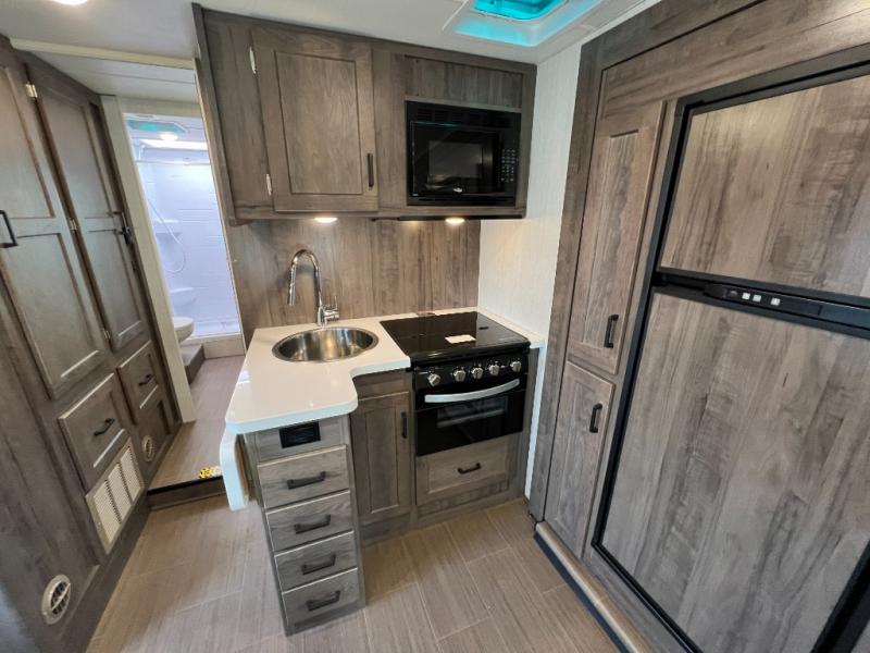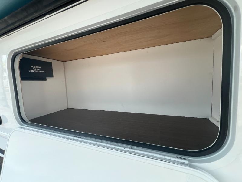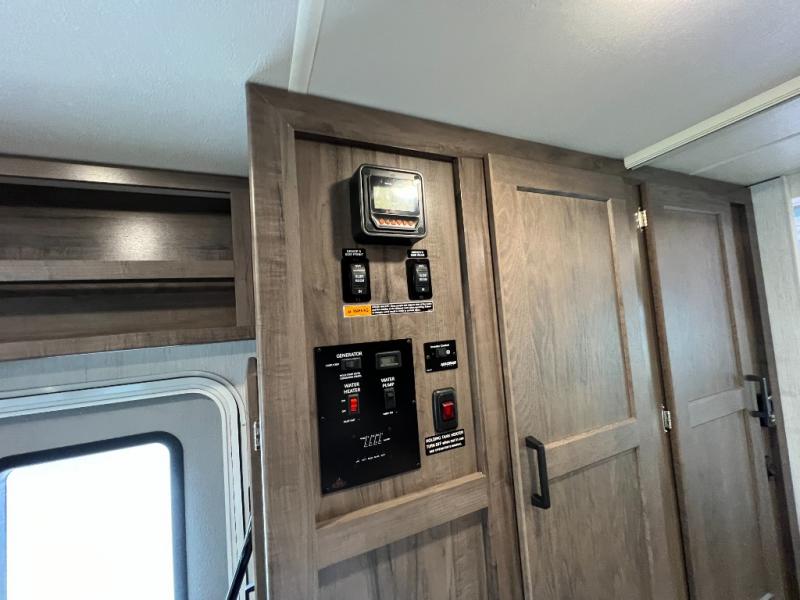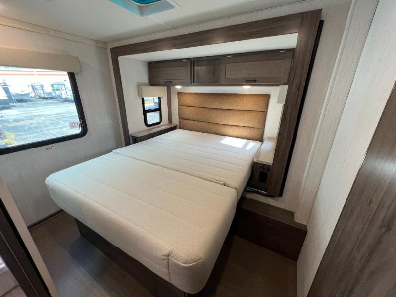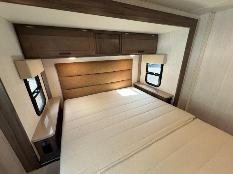 Time spent in this spacious coach will be time well spent! Whether you're dining around the U-shaped dinette, relaxing on the sofa bed, or visiting outdoors under the power awning, you're sure to have a great time. The cab-over bunk and the living room furniture will provide sleeping space for guests, and if don't have a lot of overnight guests, just choose the optional theater seating in place of the sofa bed. A three burner range and a microwave oven will let you prepare your best meals while you're on the road, plus there is an 8 cu. ft. 2-way large double door refrigerator/freezer and pantry for food storage. After a long day outdoors exploring trails, you can relax in the private bedroom on the RV queen bed slide. There are dual bedside nightstands for your things, a sliding door for more space, plus quick access into the rear corner full bath!