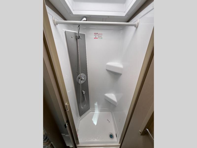 This is the perfect coach to travel with your honey or hiking buddy since there are two 32" x 76" twin beds in the back that can convert to a king-size bed if you choose! And the TrueComfort+ sofa with a movable pedestal table plus the cabover bunk will provide additional sleeping space. You can choose the optional low profile front cap with storage if you do not need the added sleeping space. There is a 25" x 30" shower across the hall from a private toilet and sink so two people can freshen up at once. You will also be able to create meals each day since there is a two-burner cooktop and convection microwave, and the 12V refrigerator will keep cold items fresh!