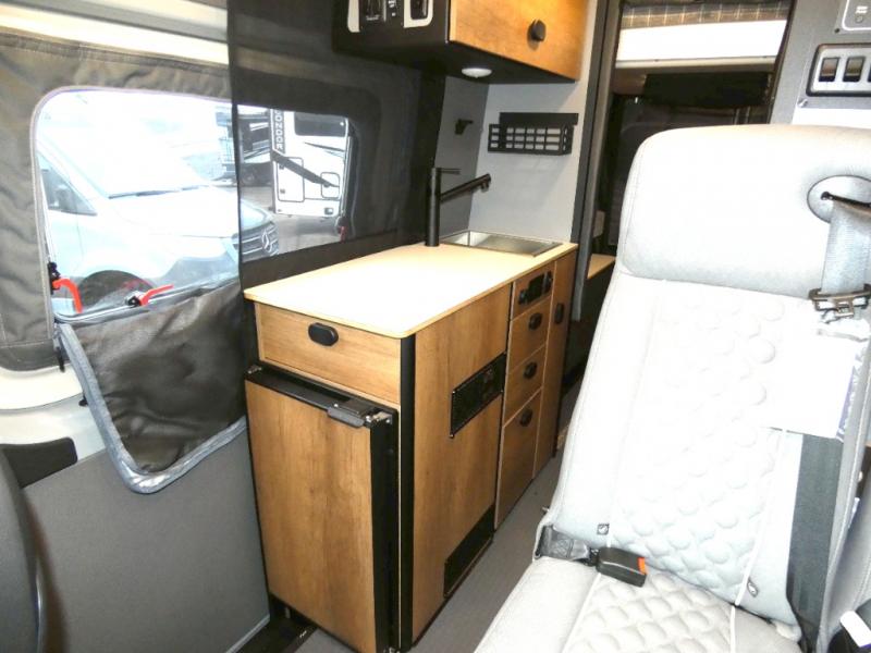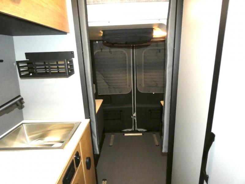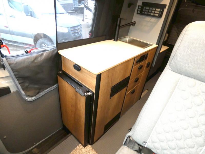 Looking for adventure yet not sure which road you'll take? This camper van offers the outdoor enthusiast a way to venture the unknown. Once at your destination, you can easily set up the interior including a power lift bed in the rear. The cab seats swivel around and there is a bench seat with adjustable table for easy dining opposite. There is even a fold-down outside table to dine outdoors if you want. You will find storage throughout including in the gear garage below the bed where you can store your hiking sticks and backpacks. The cook will have a portable single induction range top, a stainless-steel sink, and a counter extension for more prep space plus a refrigerator below the counter. There is also a wet bath to stay clean and refreshed!