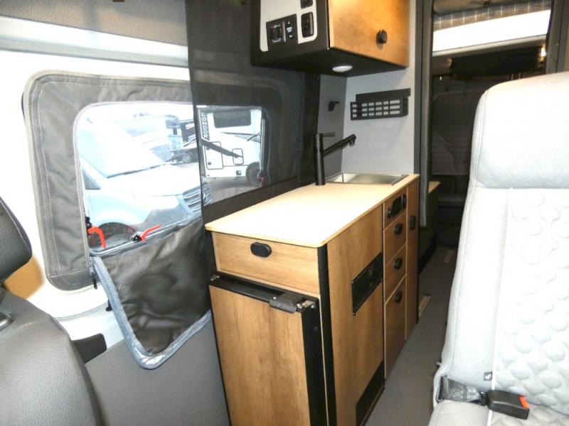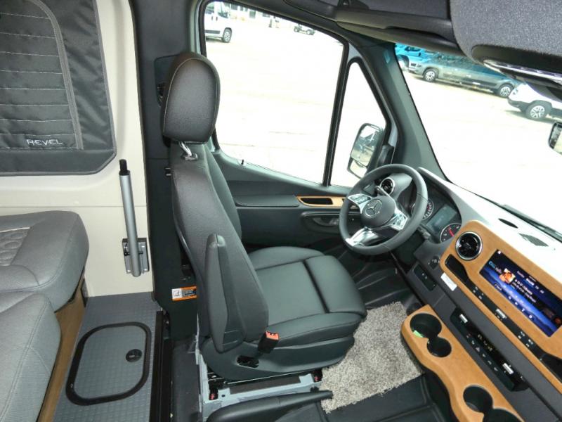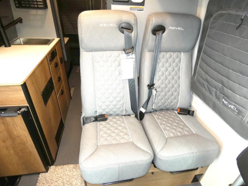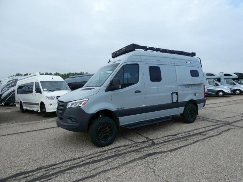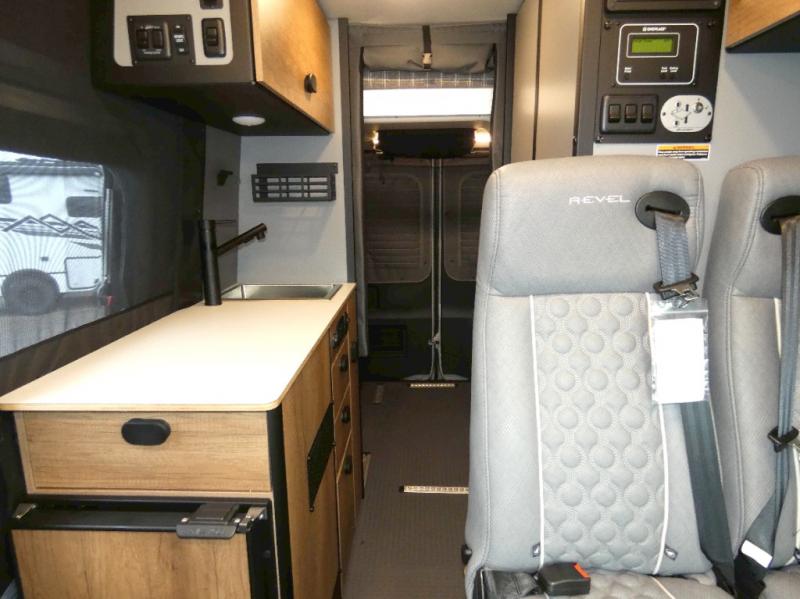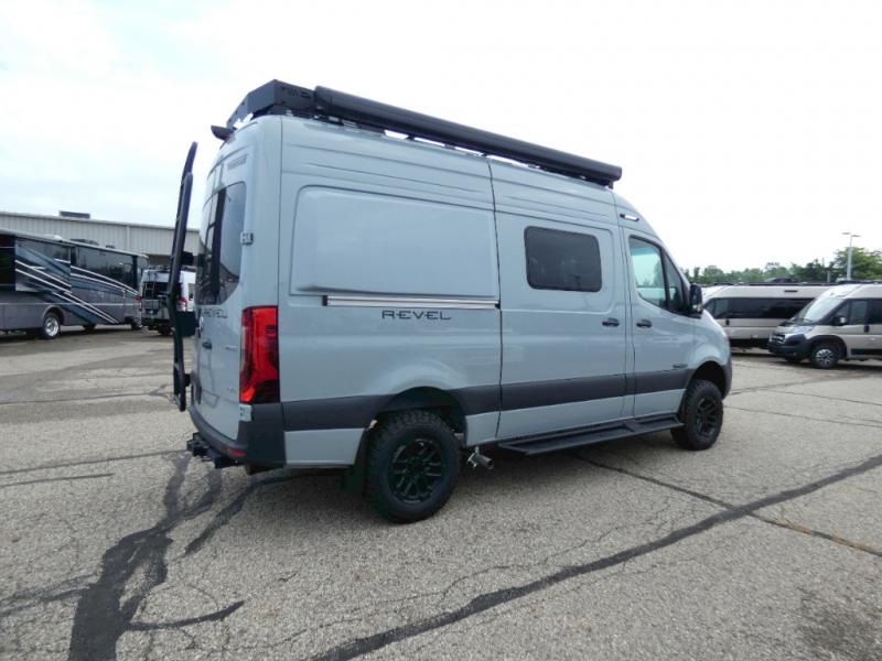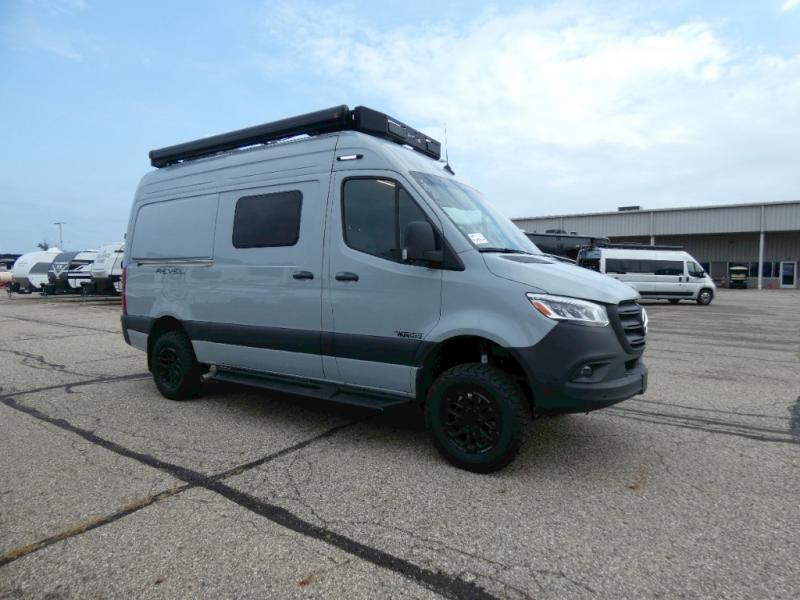 The Revel Class B diesel motorhome allows you to venture off-road thanks to the AWD Sprinter chassis with 2.0L high-output turbo-diesel 4-cylinder under the hood. The Winnebago Power MAX system (8.4kWh Lithionics lithium-ion battery with dual alternator charging capability) and Power Hub Pro which is an exclusive 5-in1 system that delivers off-grid power like nothing before allowing you to stay off-grid for up to 7 days. The interior provides a comfortable and relaxing space featuring modern decor including an updated galley with compression-latch cabinets, a new wall-mounted table, an innovative wet bath, plus a power lift bed with WinnSleep® mattress technology, and the gear garage below the bed features L-track bases for secure and flexible storage, plus cabinet storage and more.