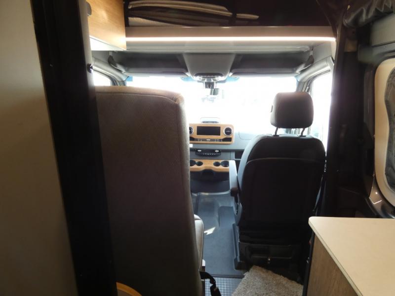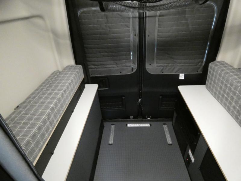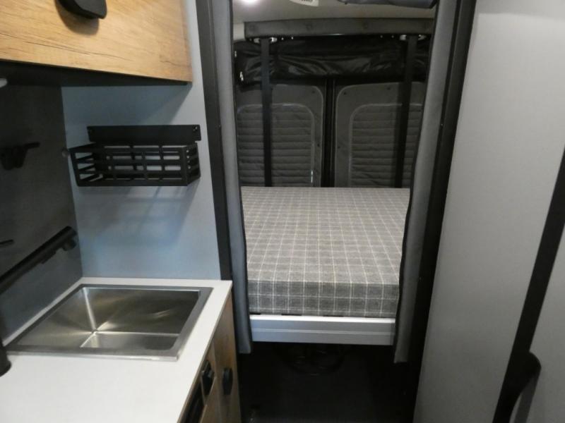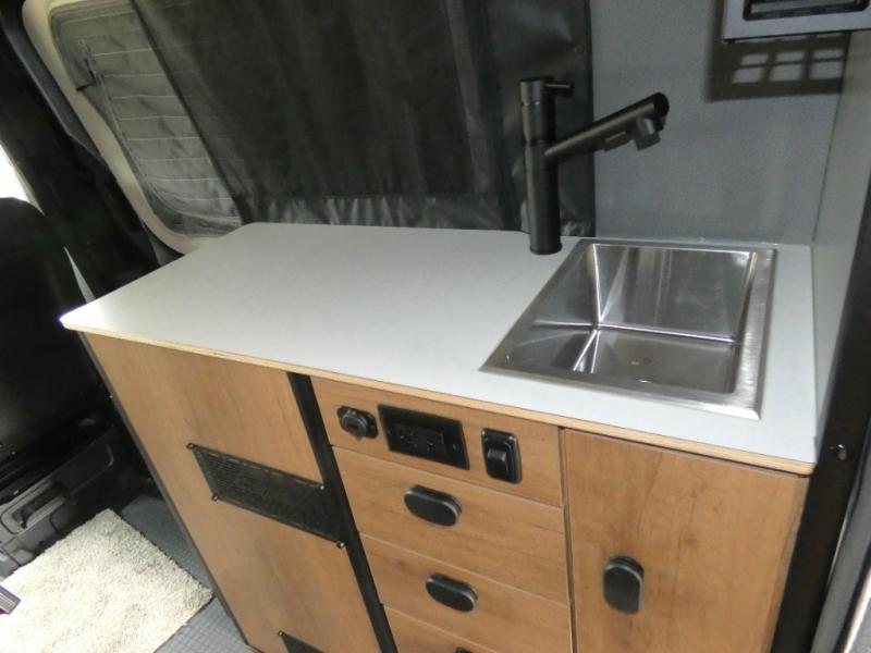 Looking for adventure yet not sure which road you'll take? This camper van offers the outdoor enthusiast a way to venture the unknown. Once at your destination, you can easily set up the interior including a power lift bed in the rear. The cab seats swivel around and there is a bench seat with adjustable table for easy dining opposite. There is even a fold-down outside table to dine outdoors if you want. You will find storage throughout including in the gear garage below the bed where you can store your hiking sticks and backpacks. The cook will have a portable single induction range top, a stainless-steel sink, and a counter extension for more prep space plus a refrigerator below the counter. There is also a wet bath to stay clean and refreshed!