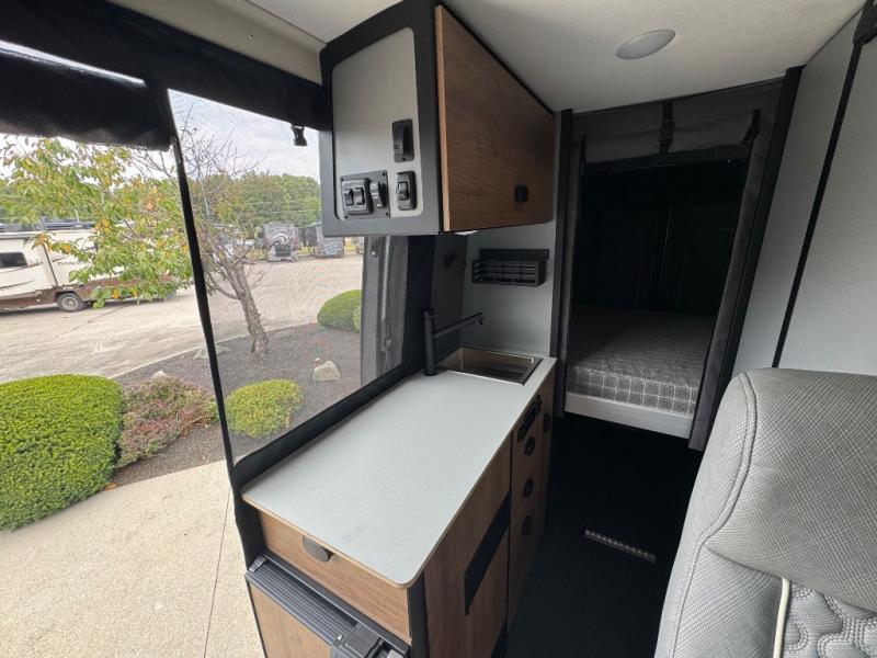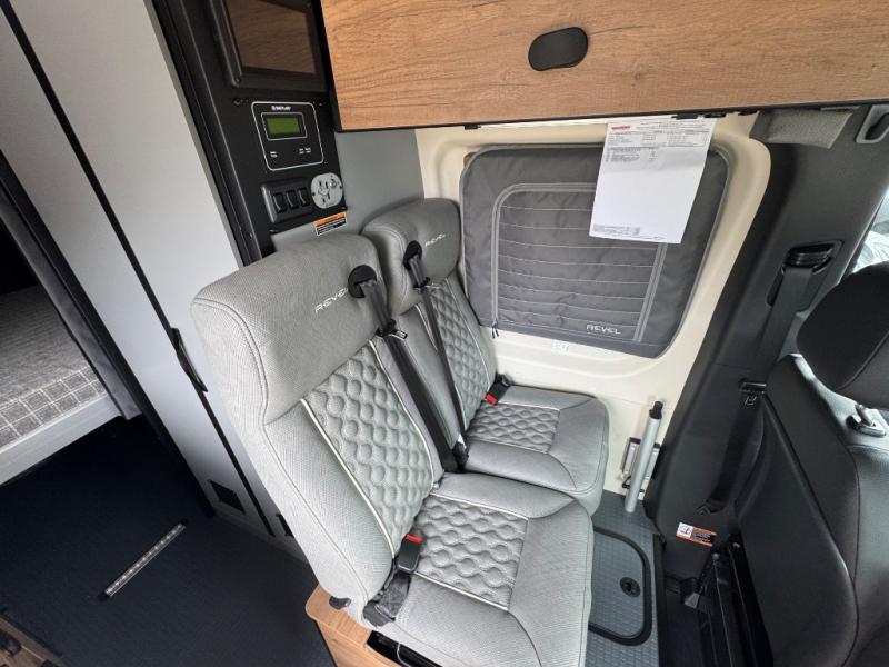 The Revel Class B diesel motorhome allows you to venture off-road thanks to the AWD Sprinter chassis with 2.0L high-output turbo-diesel 4-cylinder under the hood. The Winnebago Power MAX system (8.4kWh Lithionics lithium-ion battery with dual alternator charging capability) and Power Hub Pro which is an exclusive 5-in1 system that delivers off-grid power like nothing before allowing you to stay off-grid for up to 7 days. The interior provides a comfortable and relaxing space featuring modern decor including an updated galley with compression-latch cabinets, a new wall-mounted table, an innovative wet bath, plus a power lift bed with WinnSleep® mattress technology, and the gear garage below the bed features L-track bases for secure and flexible storage, plus cabinet storage and more.