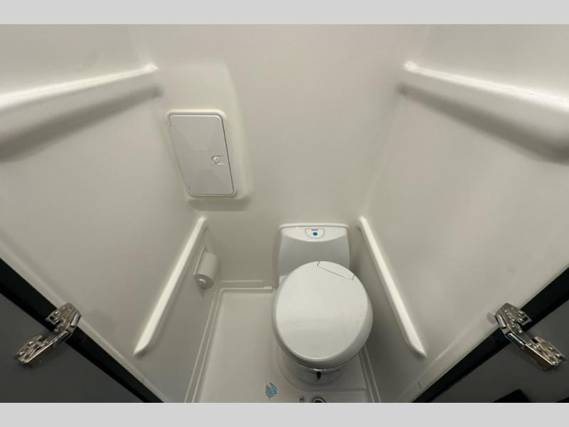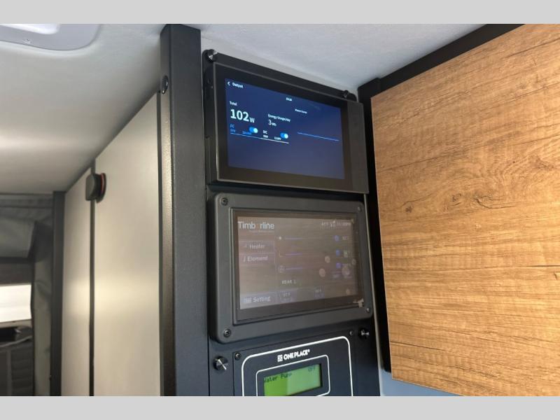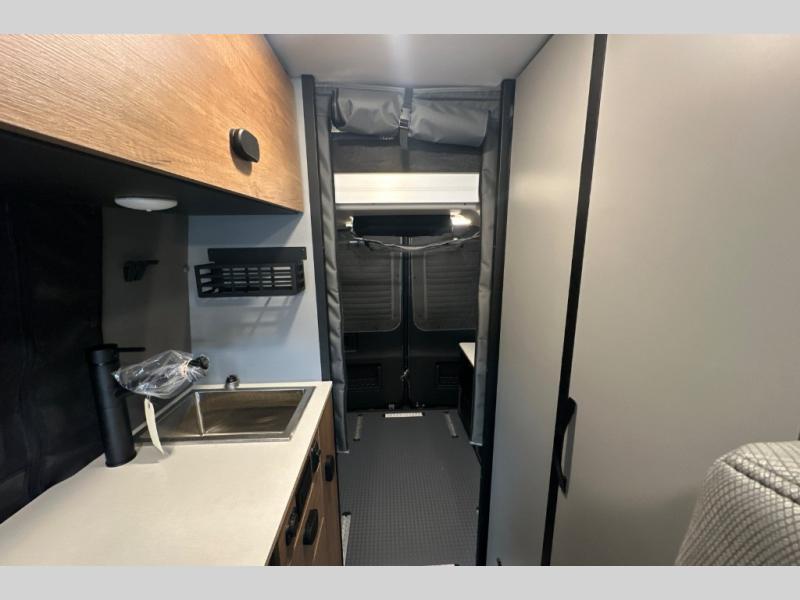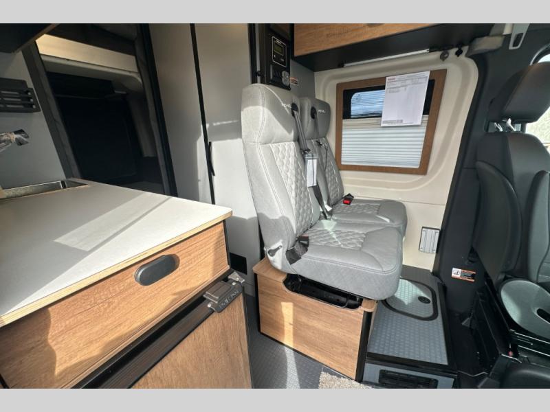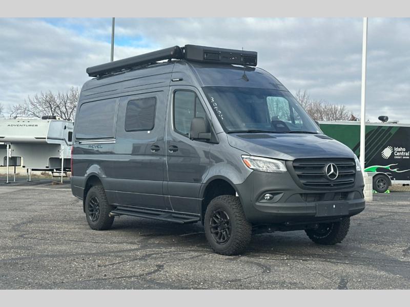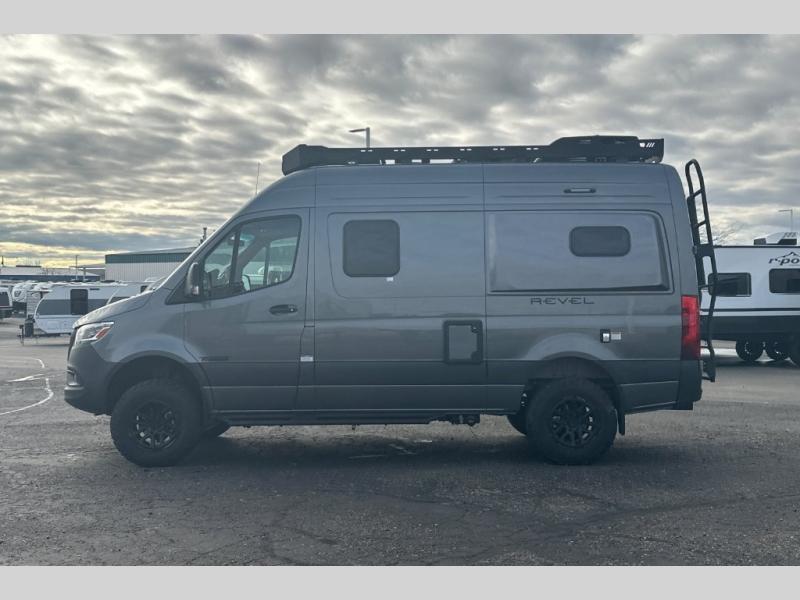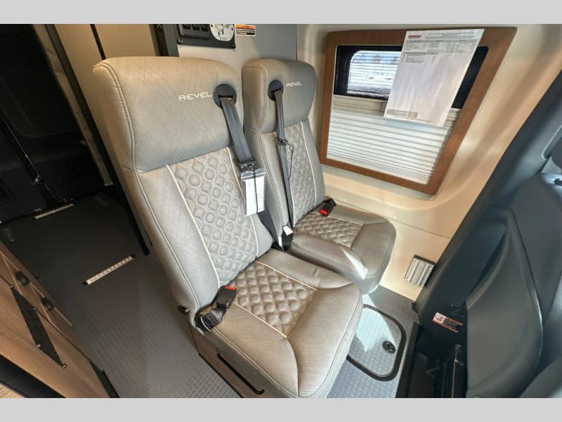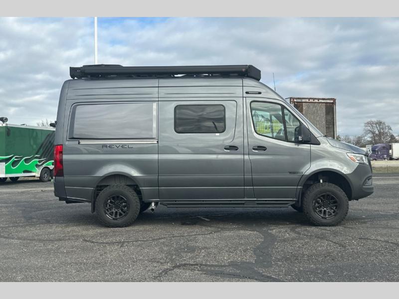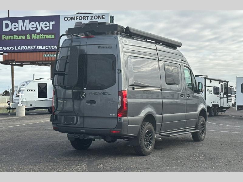 The Revel Class B diesel motorhome allows you to venture off-road thanks to the AWD Sprinter chassis with 2.0L high-output turbo-diesel 4-cylinder under the hood. The Winnebago Power MAX system (8.4kWh Lithionics lithium-ion battery with dual alternator charging capability) and Power Hub Pro which is an exclusive 5-in1 system that delivers off-grid power like nothing before allowing you to stay off-grid for up to 7 days. The interior provides a comfortable and relaxing space featuring modern decor including an updated galley with compression-latch cabinets, a new wall-mounted table, an innovative wet bath, plus a power lift bed with WinnSleep® mattress technology, and the gear garage below the bed features L-track bases for secure and flexible storage, plus cabinet storage and more.