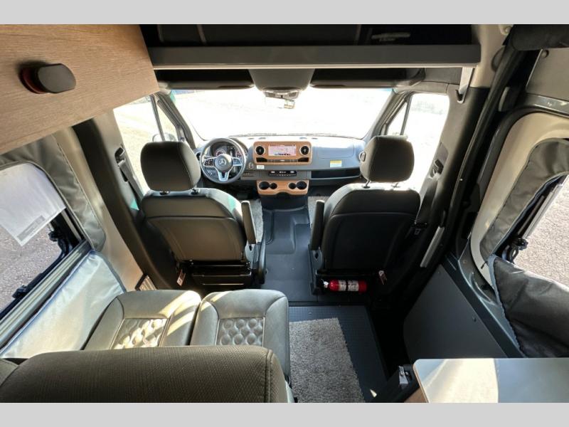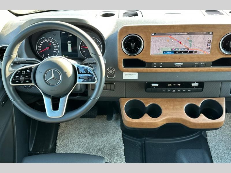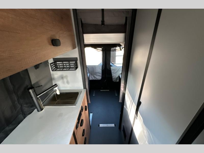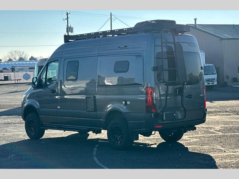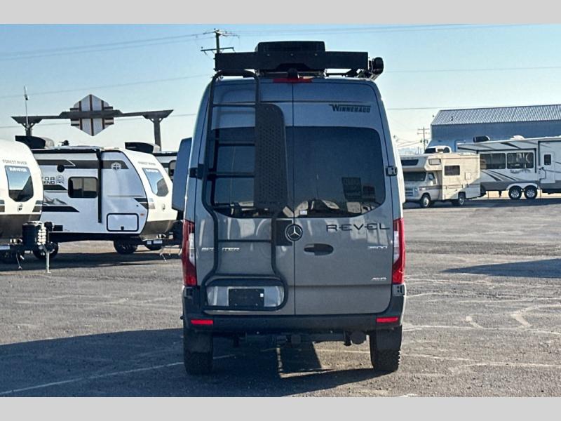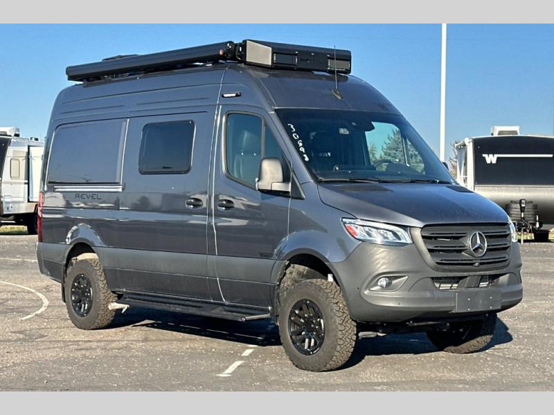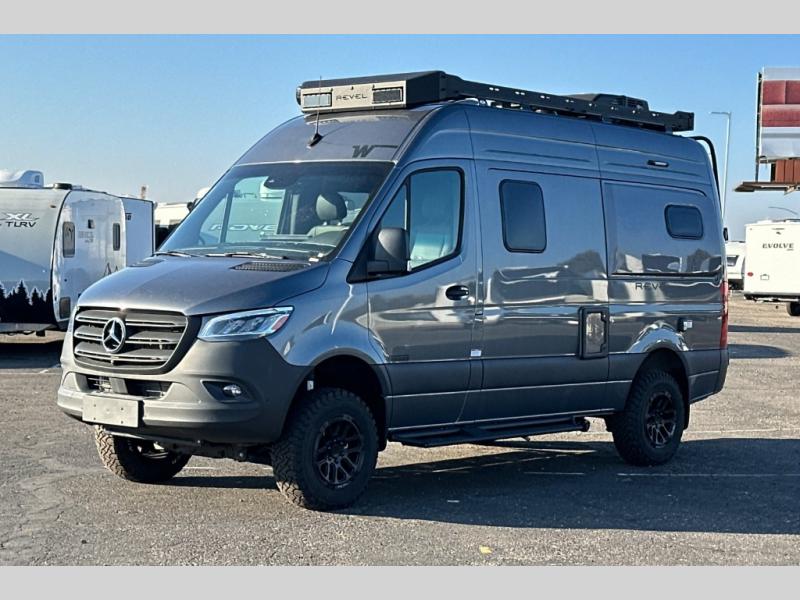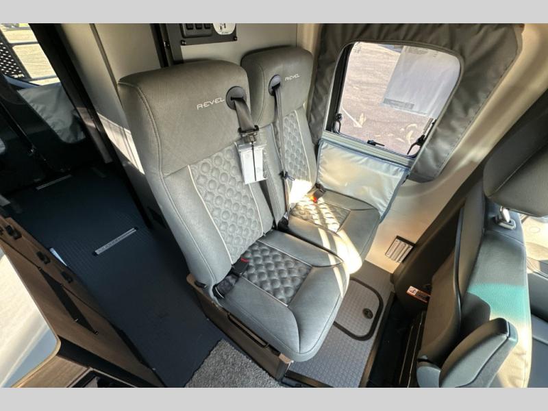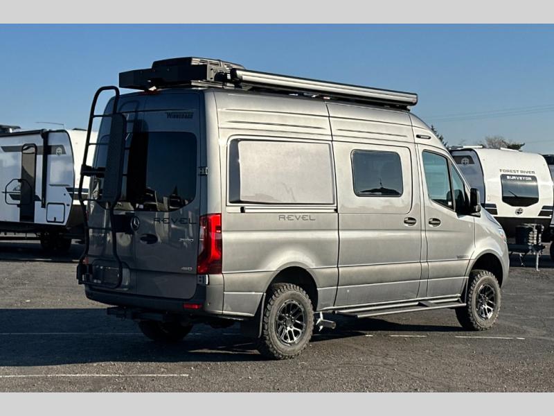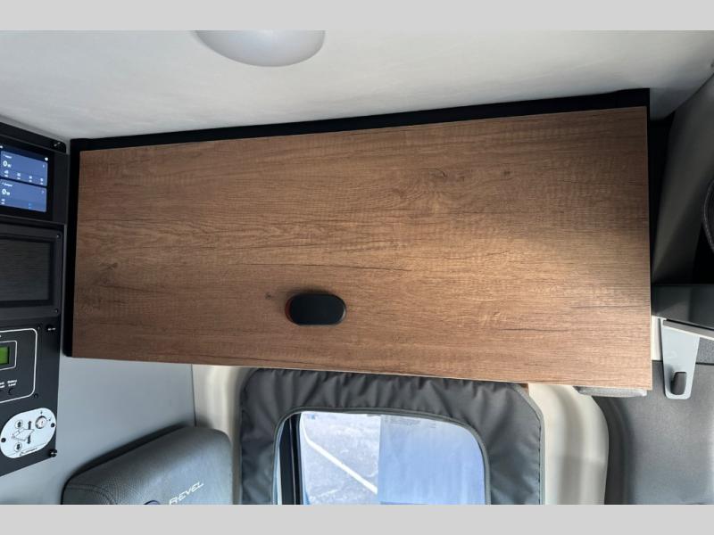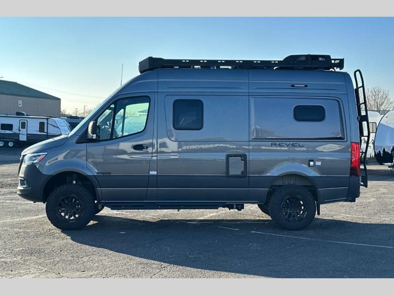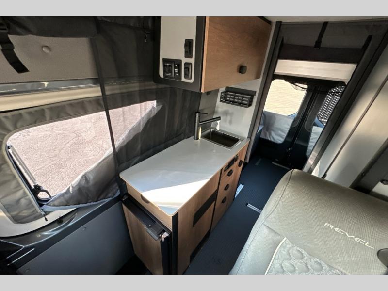 The Revel Class B diesel motorhome allows you to venture off-road thanks to the AWD Sprinter chassis with 2.0L high-output turbo-diesel 4-cylinder under the hood. The Winnebago Power MAX system (8.4kWh Lithionics lithium-ion battery with dual alternator charging capability) and Power Hub Pro which is an exclusive 5-in1 system that delivers off-grid power like nothing before allowing you to stay off-grid for up to 7 days. The interior provides a comfortable and relaxing space featuring modern decor including an updated galley with compression-latch cabinets, a new wall-mounted table, an innovative wet bath, plus a power lift bed with WinnSleep® mattress technology, and the gear garage below the bed features L-track bases for secure and flexible storage, plus cabinet storage and more.
