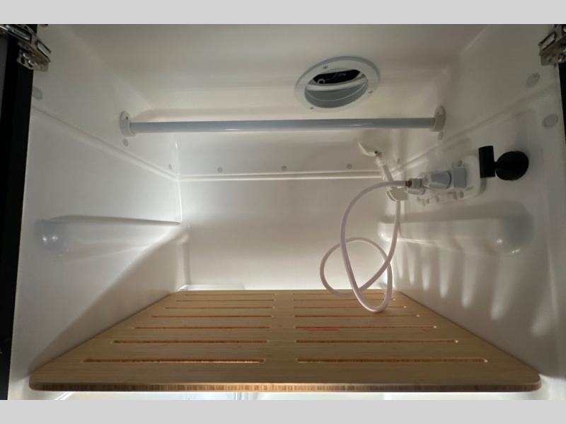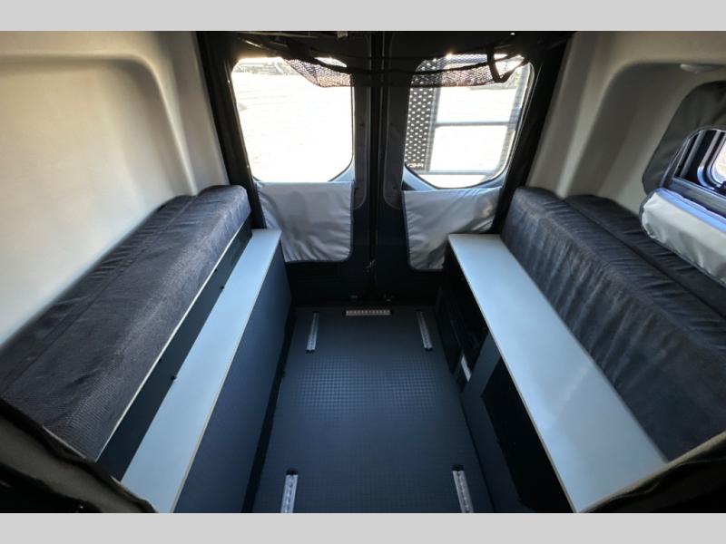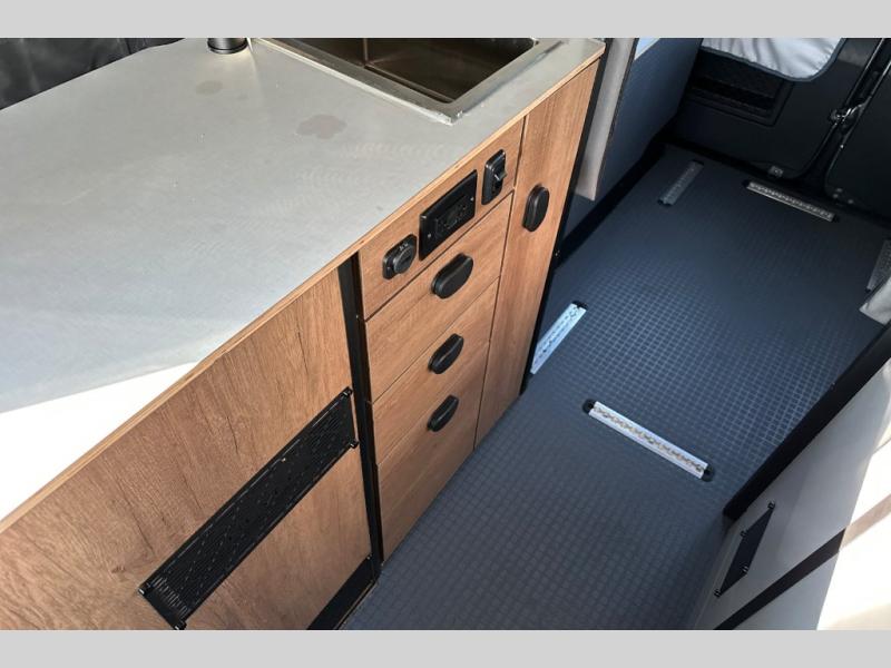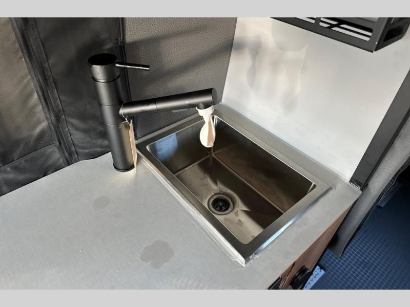 Looking for adventure yet not sure which road you'll take? This camper van offers the outdoor enthusiast a way to venture the unknown. Once at your destination, you can easily set up the interior including a power lift bed in the rear. The cab seats swivel around and there is a bench seat with adjustable table for easy dining opposite. There is even a fold-down outside table to dine outdoors if you want. You will find storage throughout including in the gear garage below the bed where you can store your hiking sticks and backpacks. The cook will have a portable single induction range top, a stainless-steel sink, and a counter extension for more prep space plus a refrigerator below the counter. There is also a wet bath to stay clean and refreshed!