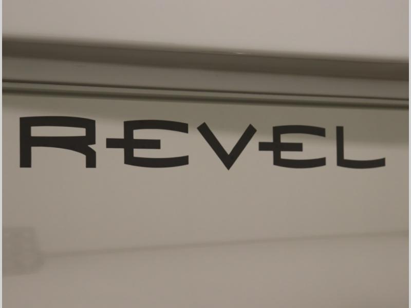 Inside, the Revel’s unique features start with a floorplan designed around a Power Lift Bed with gear garage below. This allows for a 49 x 79 inch cross coach sleeping area. A full galley, including a larger refrigerator, makes meal prep a breeze, while the all in one bath and gear closet boasts a cassette style toilet that eliminates the need for a separate black water holding tank.