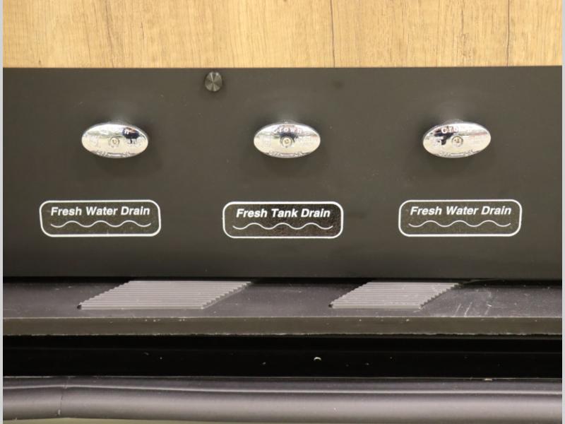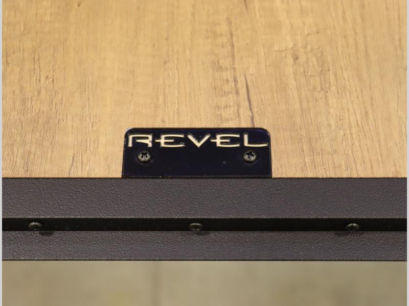 Storage and living space are maximized by the flared body and Power Lift Bed that converts to a sleeping surface. Welded aluminum cabinet face frames, dual pane windows with insulated shades, and an available quieter Mach 10 NDQ AC system all contribute to the Revel's off the grid livability.