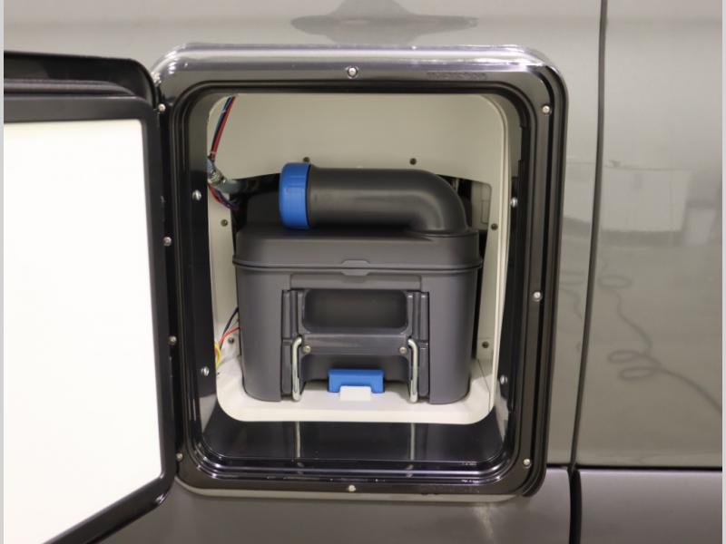 Inside, the Revel’s unique features start with a floorplan designed around a Power Lift Bed with gear garage below. This allows for a 49 x 79 inch cross coach sleeping area. A full galley, including a larger refrigerator, makes meal prep a breeze, while the all in one bath and gear closet boasts a cassette style toilet that eliminates the need for a separate black water holding tank.