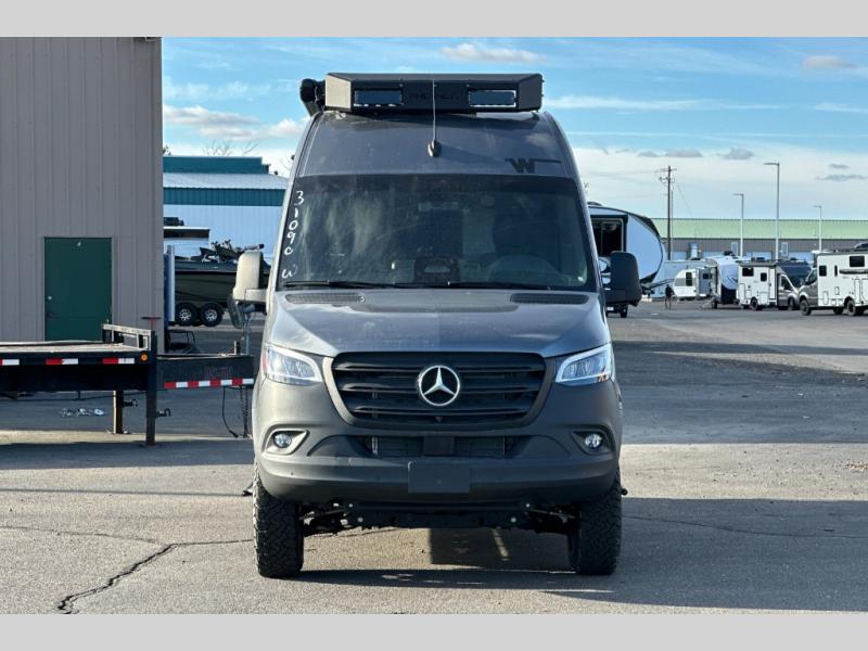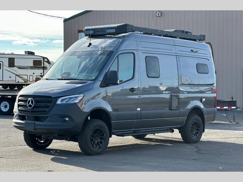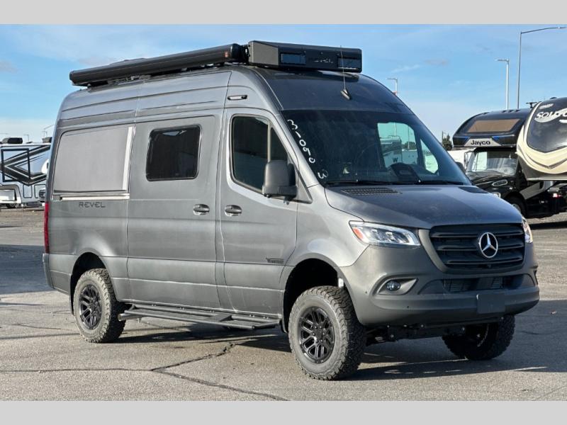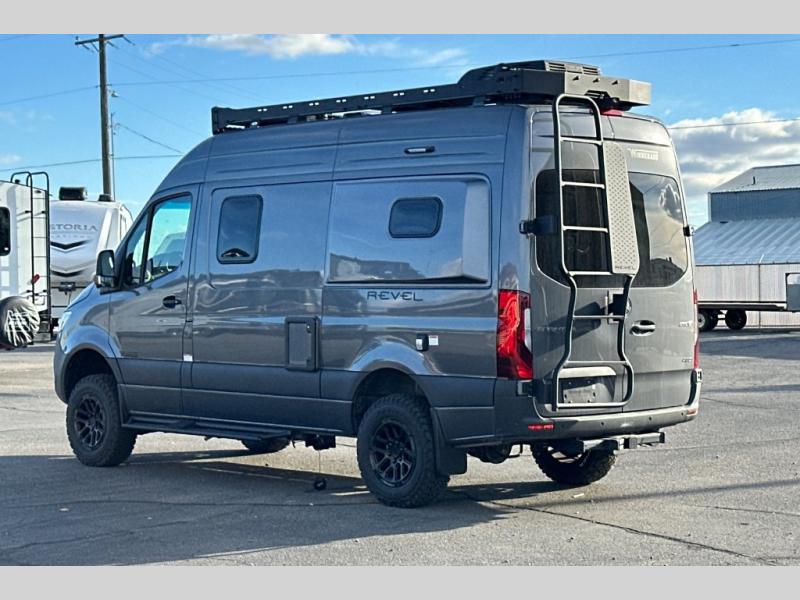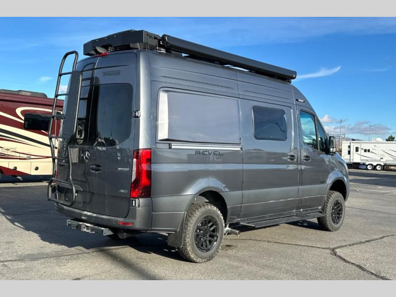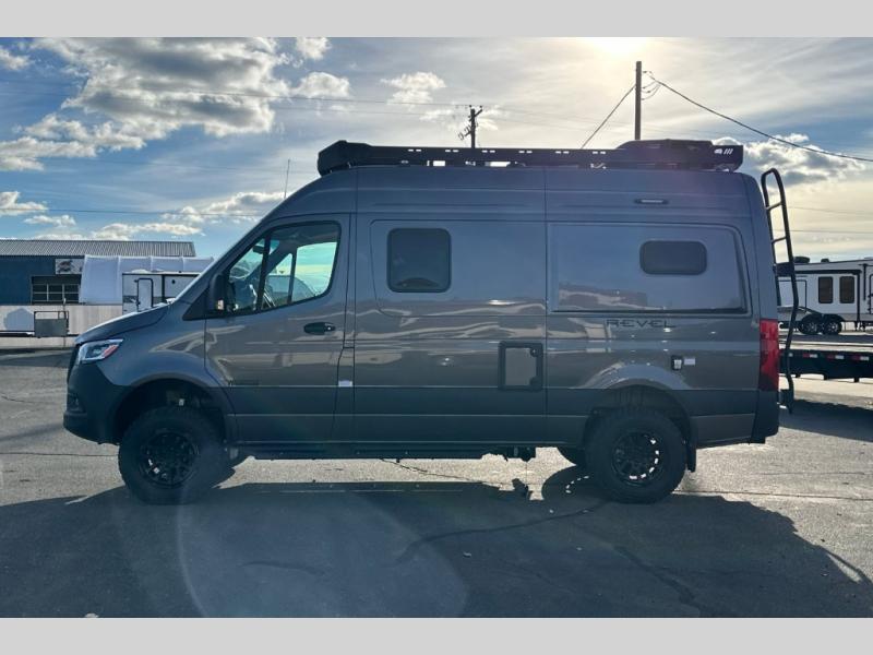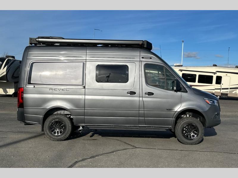 The Revel Class B diesel motorhome allows you to venture off-road thanks to the AWD Sprinter chassis with 2.0L high-output turbo-diesel 4-cylinder under the hood. The Winnebago Power MAX system (8.4kWh Lithionics lithium-ion battery with dual alternator charging capability) and Power Hub Pro which is an exclusive 5-in1 system that delivers off-grid power like nothing before allowing you to stay off-grid for up to 7 days. The interior provides a comfortable and relaxing space featuring modern decor including an updated galley with compression-latch cabinets, a new wall-mounted table, an innovative wet bath, plus a power lift bed with WinnSleep® mattress technology, and the gear garage below the bed features L-track bases for secure and flexible storage, plus cabinet storage and more.