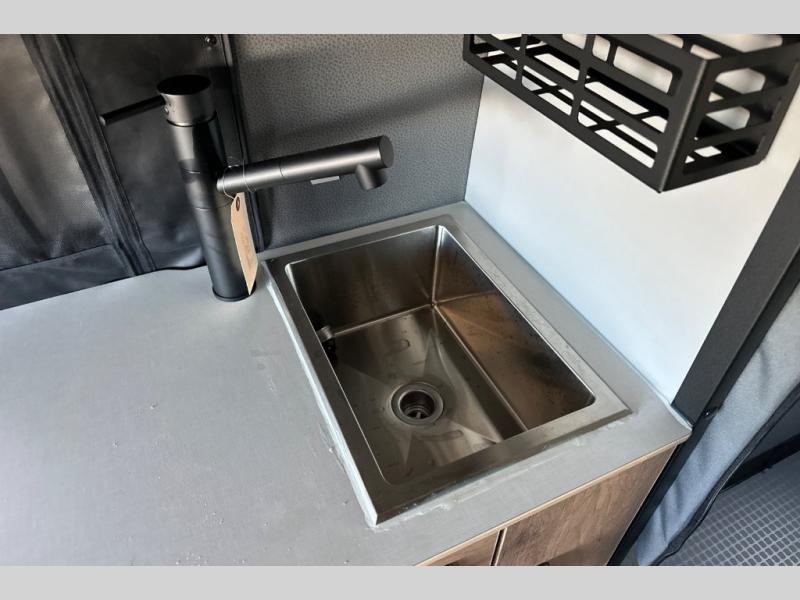 Looking for adventure yet not sure which road you'll take? This camper van offers the outdoor enthusiast a way to venture the unknown. Once at your destination, you can easily set up the interior including a power lift bed in the rear. The cab seats swivel around and there is a bench seat with adjustable table for easy dining opposite. There is even a fold-down outside table to dine outdoors if you want. You will find storage throughout including in the gear garage below the bed where you can store your hiking sticks and backpacks. The cook will have a portable single induction range top, a stainless-steel sink, and a counter extension for more prep space plus a refrigerator below the counter. There is also a wet bath to stay clean and refreshed!