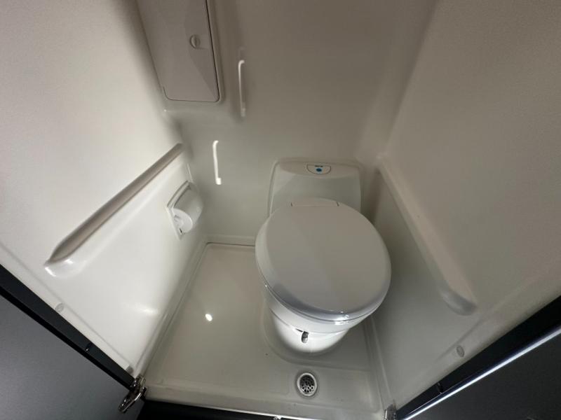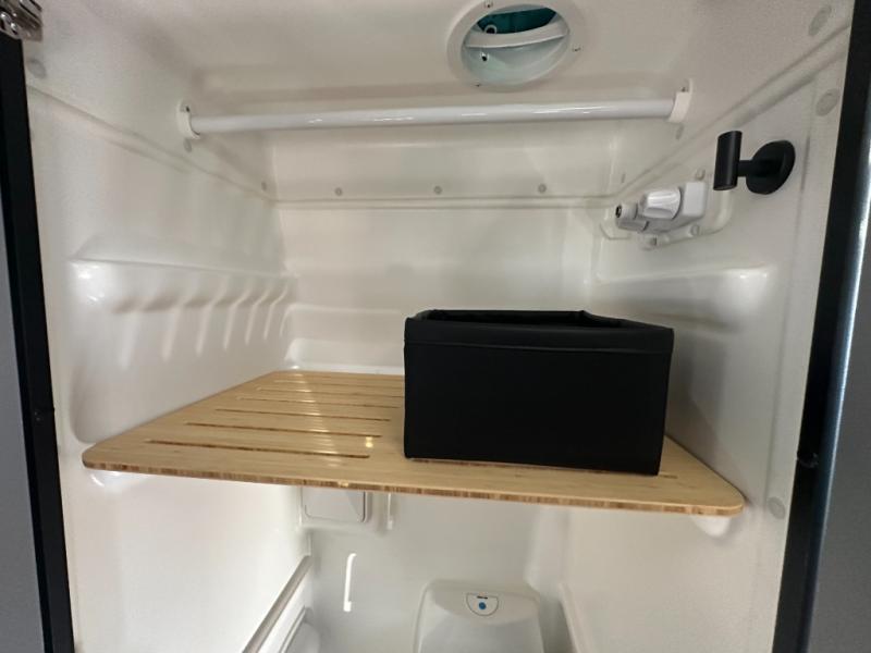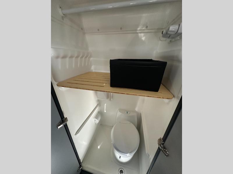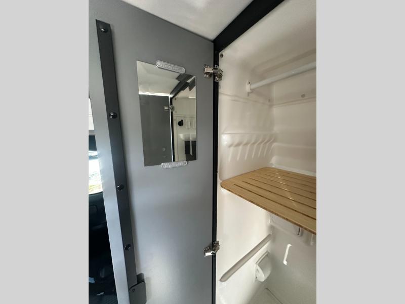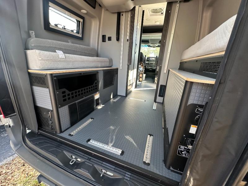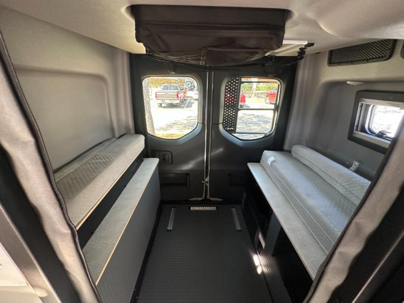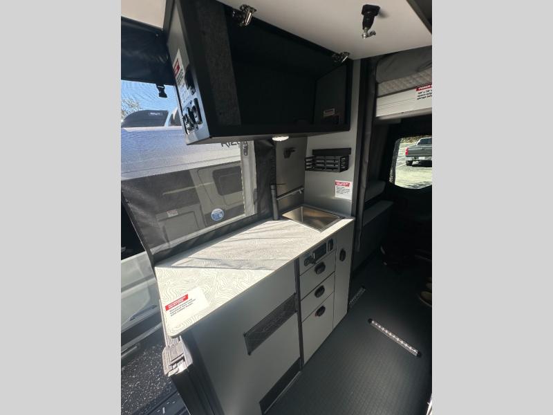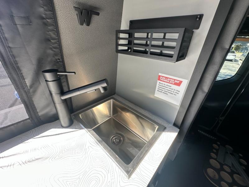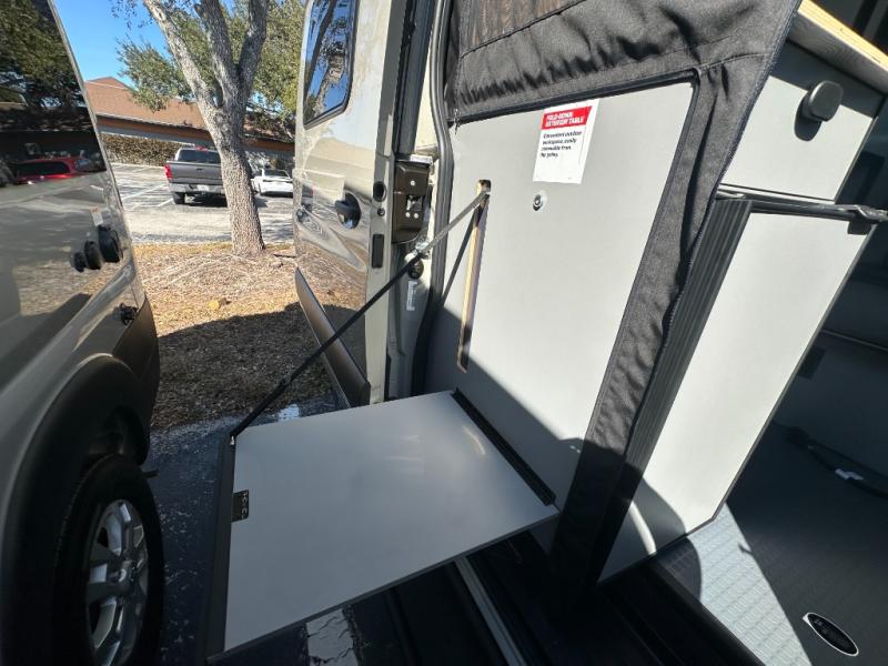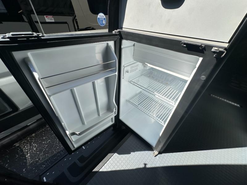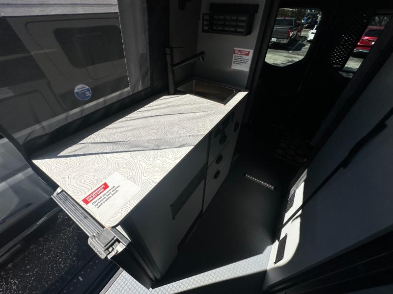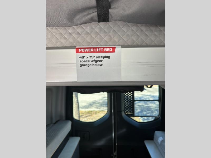 At the front, the driver and passenger seats are designed for comfort with heating, adjustable lumbar support, and adjustable headrests, complemented by folding privacy shades on the front and cab door windows. Above, a spacious 21" x 56" overhead cab shelf provides convenient storage for gear and clothing. Along the side, a forward-facing lounge seat with seatbelts pairs with an adjustable, removable table, while additional storage is tucked neatly behind the seat. Nearby, you’ll find an all-in-one gear garage and a 31" x 26" wet bath featuring a space-saving bi-fold door. Across from this area is a compact yet functional kitchen setup with a portable single-burner induction cooktop and dedicated storage, a 3 cu. ft. single-door refrigerator/freezer, and a stainless-steel sink with a pull-out sprayer, plus a pantry for dry goods. For added versatility, meals can also be enjoyed outdoors using the fold-down exterior table. At the rear, a 49" x 79" power lift bed sits above a gear garage, offering ample storage space for all your equipment while traveling.
