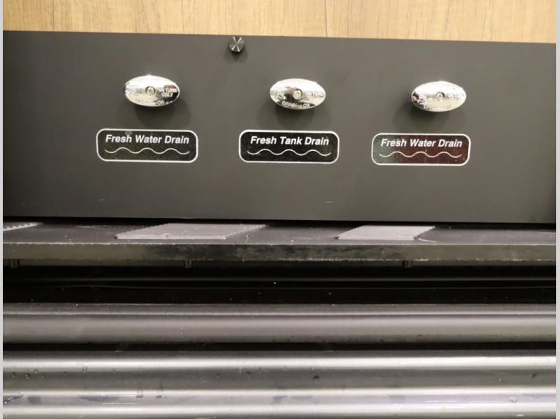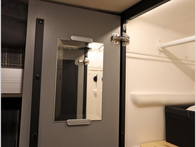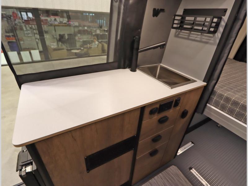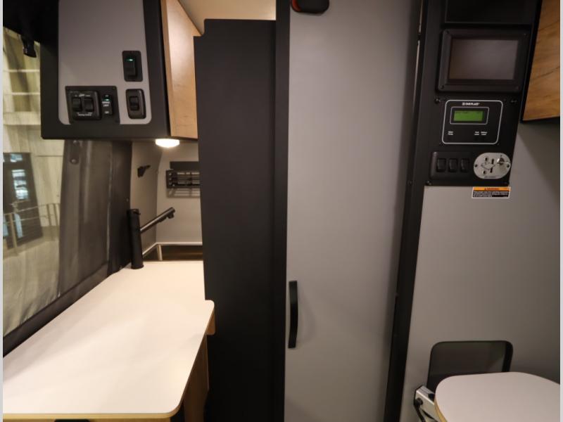 Storage and living space are maximized by the flared body and Power Lift Bed that converts to a sleeping surface. Welded aluminum cabinet face frames, dual pane windows with insulated shades, and an available quieter Mach 10 NDQ AC system all contribute to the Revel's off the grid livability.